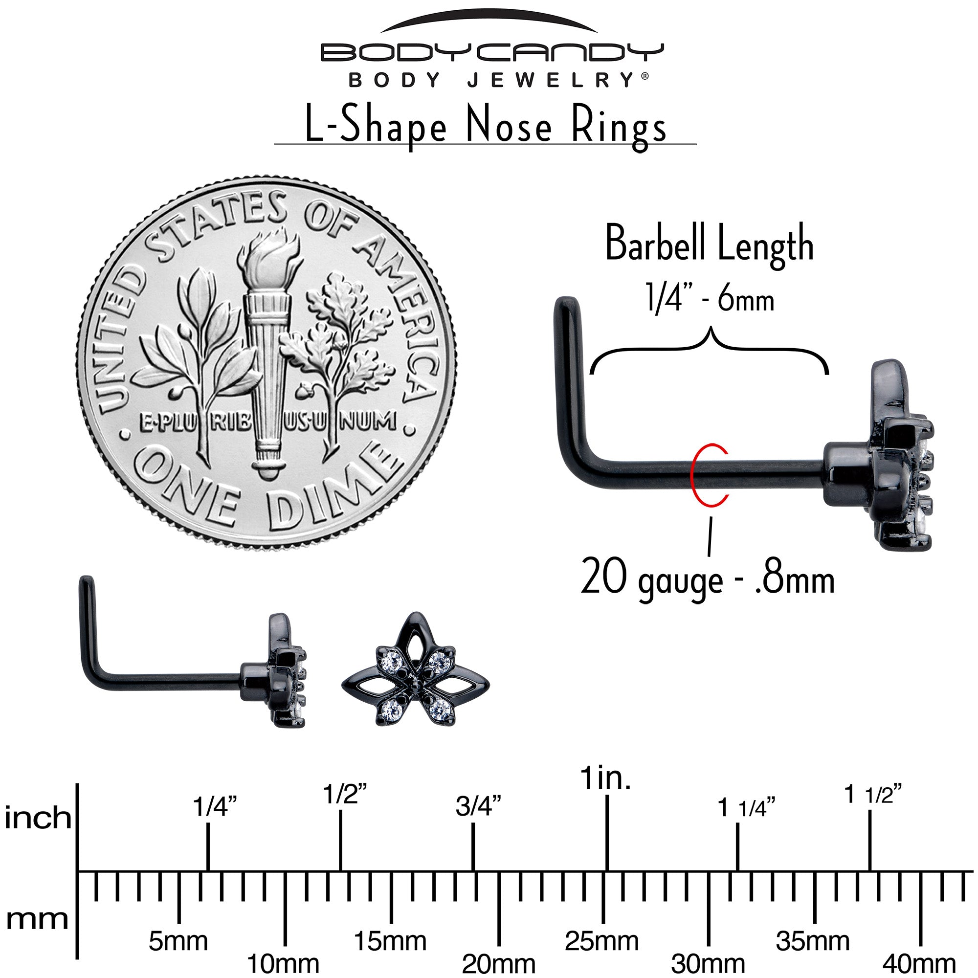 20 Gauge 7mm Clear CZ Gem Black Gothic Star L Shape Nose Ring