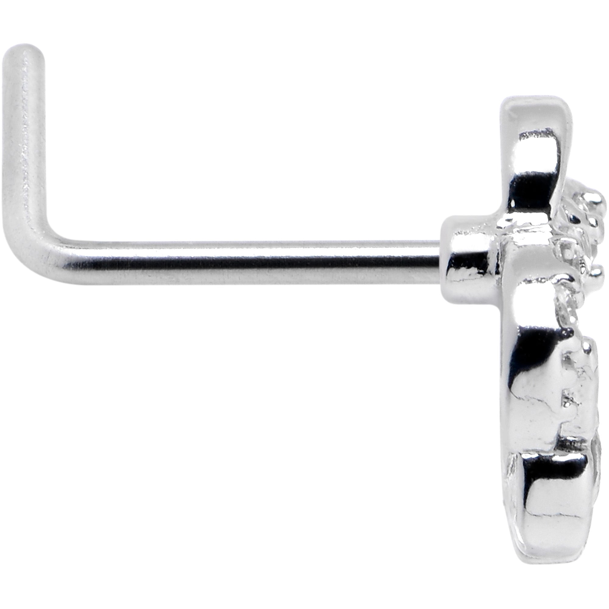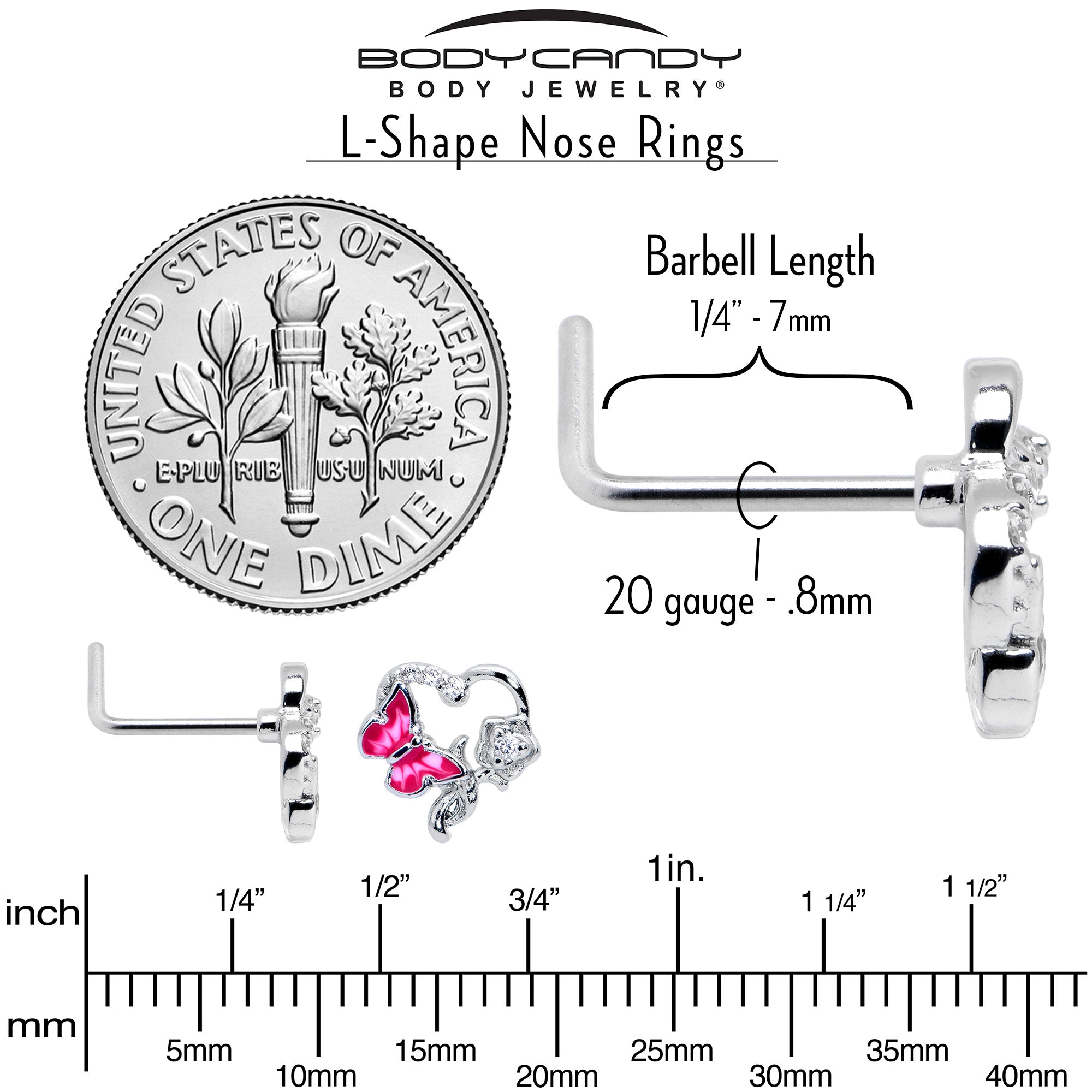 20 Gauge 7mm Clear CZ Gem Butterfly Rose Flower Pink L Shape Nose Ring