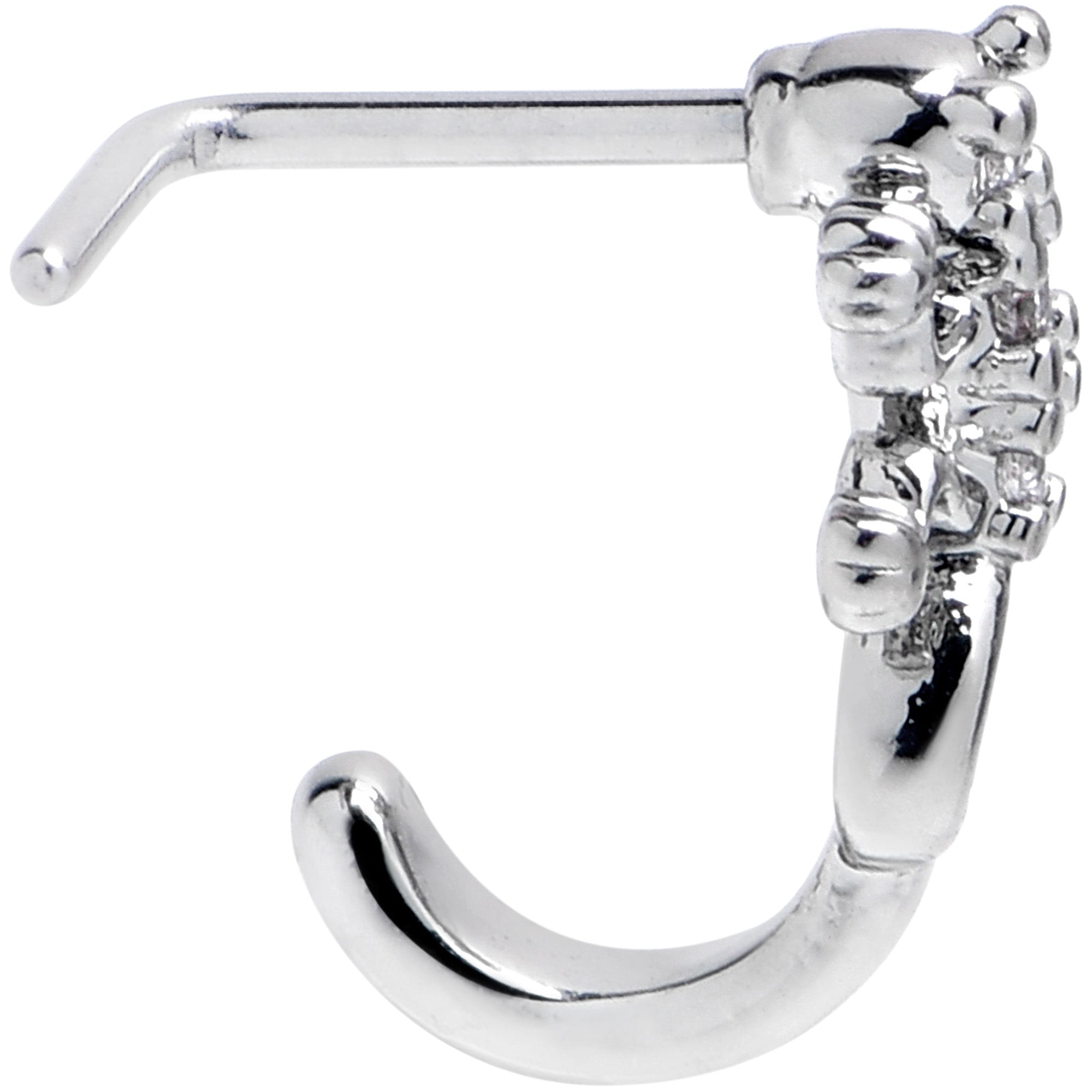 You can't help but love the cutie chameleon on this 20 gauge nostril ring. It's made with a .027 inch length at the bend 316L surgical grade stainless steel L-shaped post. It features a curving portion to emulate the look of a hoop, with a lizard embellishment that is set with clear cubic zirconia gems. However the L-shaped style still makes for easy insertion and removal that you're sure to love. This is one little lizard you can't help but love on this rockin' reptile themed nose piercing jewelry.