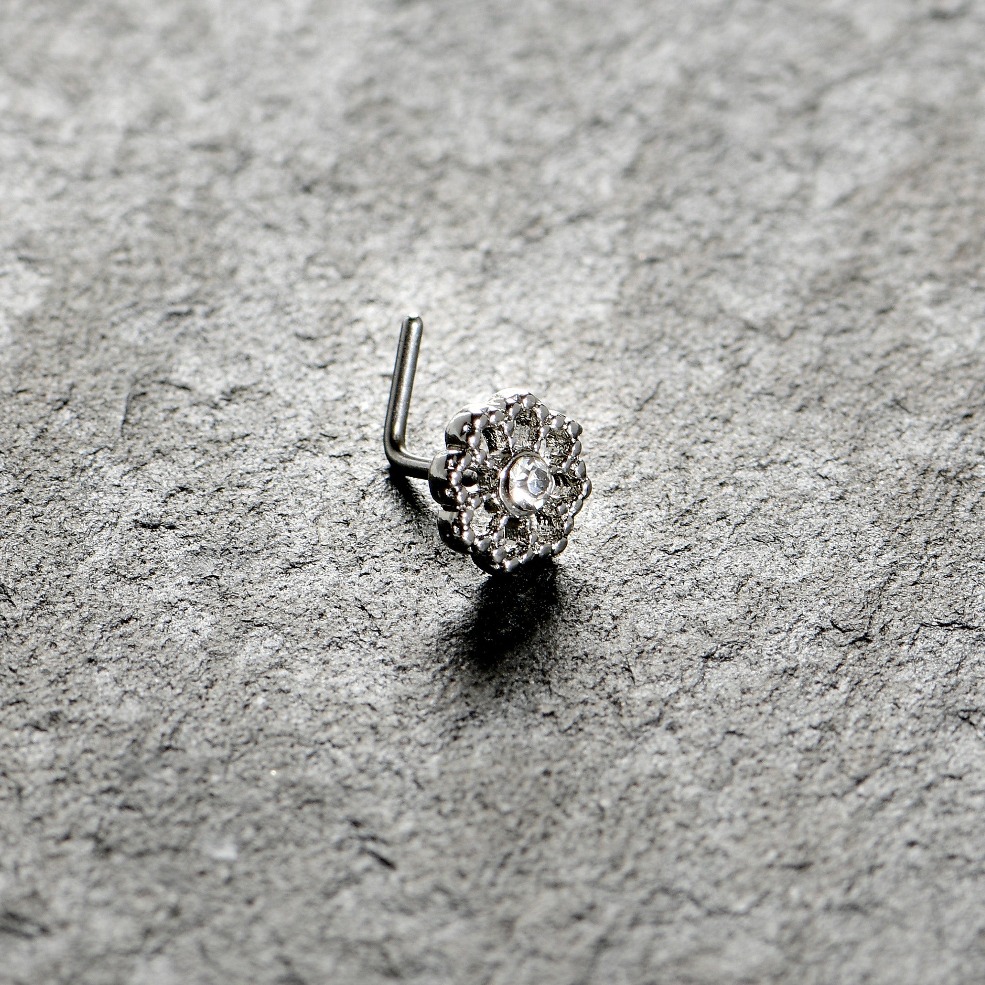 For maximum style, go epic, like on this 20 gauge nostril ring! It's made with a .27" length at the bend 316L surgical grade stainless steel L-shaped post. It features a flower charm, heavily embellished with a clear gem center and textured detailing for maximum impact. If you're looking for flowers with style to spare, this nose piercing ring is sure to please!