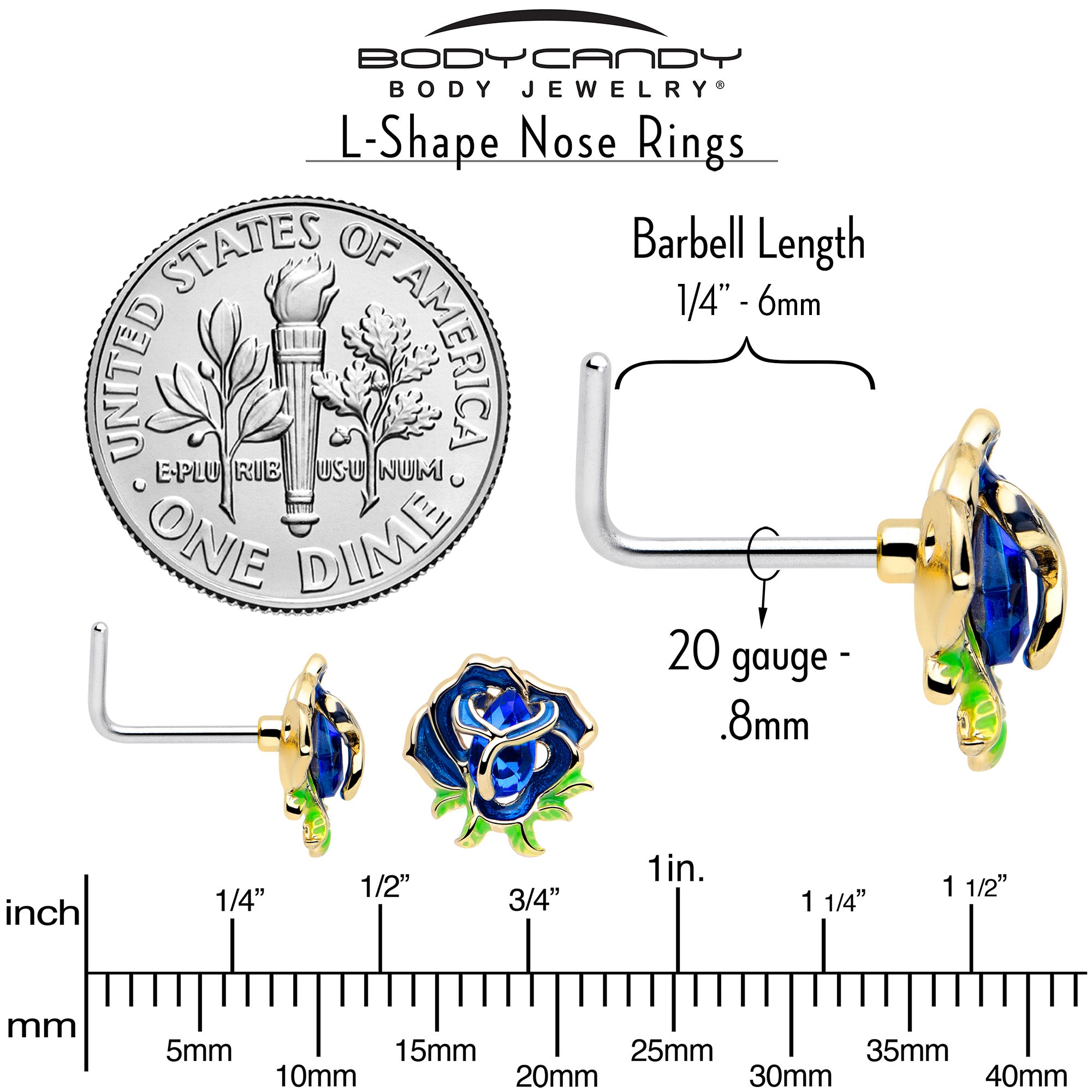 Dive into the depths of style with this 20 gauge nostril ring. It's made with a 0.27 inch length at the bend 316L surgical grade stainless steel L-shaped post. It features a flower charm, inlaid in the deepest of blues. It is further embellished with a matching deep blue gem center and green leafy detailing at the bottom. Get the blues in the best way possible with this fabulous floral flower nose piercing jewelry.