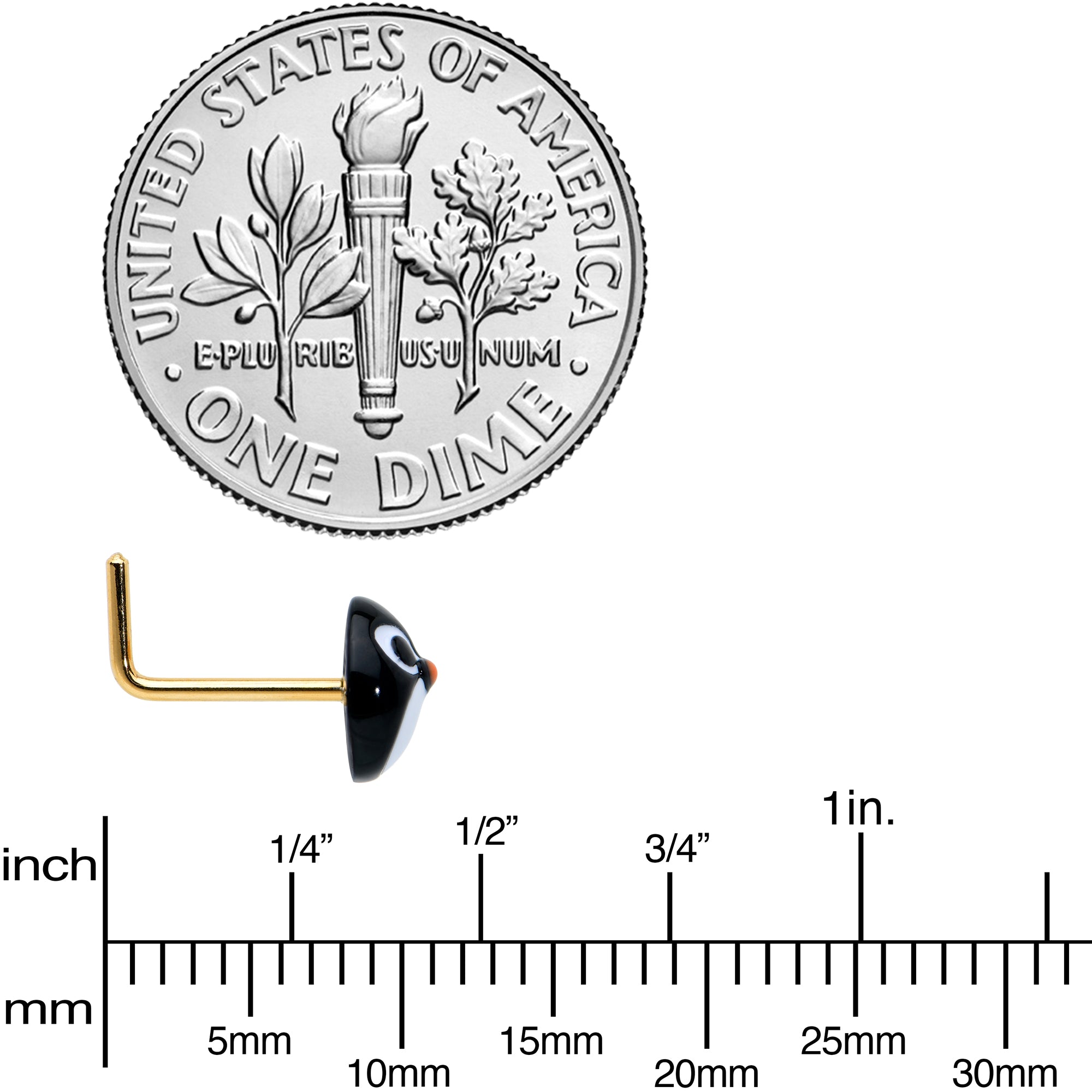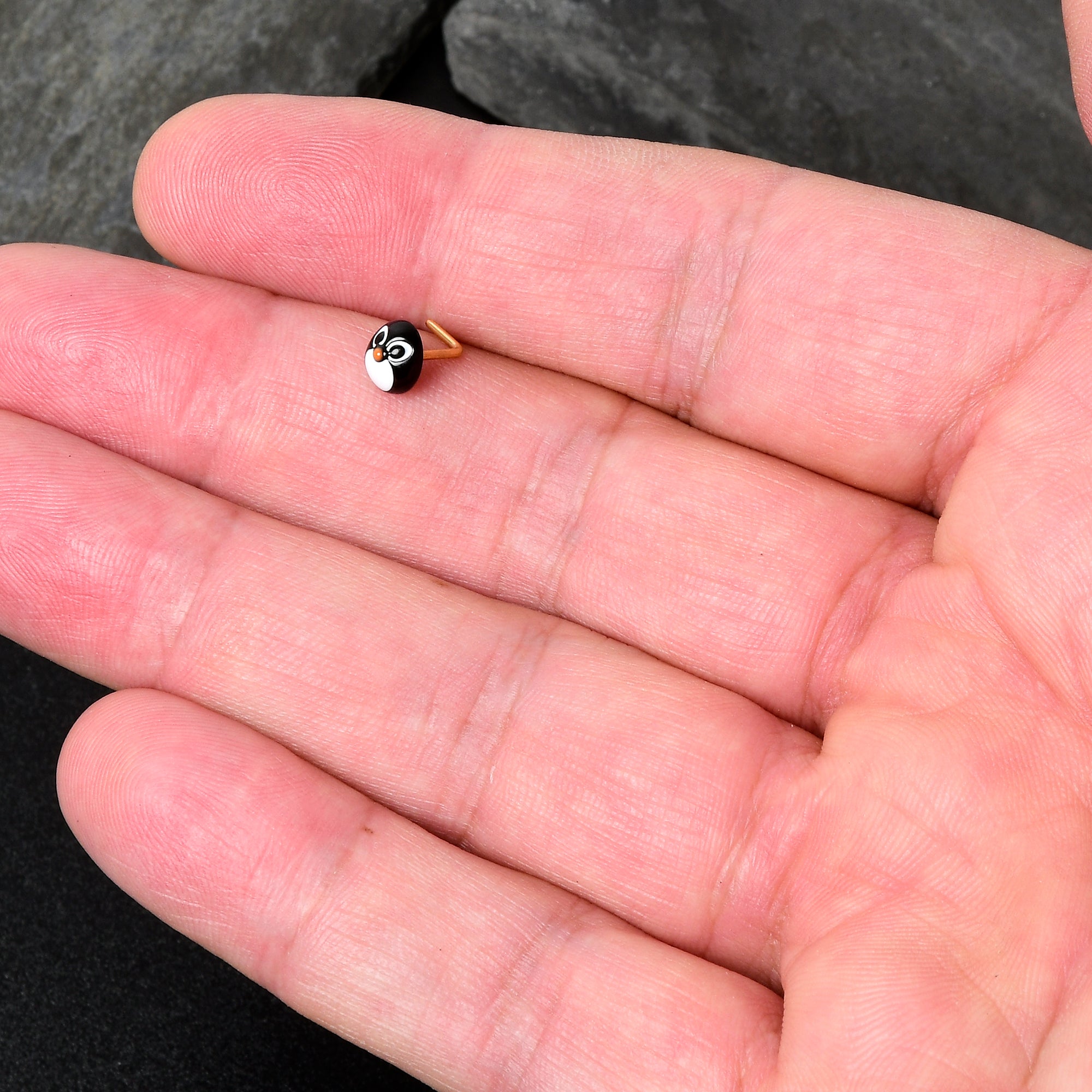 Talk about cute when you're rocking this 20 gauge nostril ring! It's made with a .27" length at the bend gold tone PVD over 316L surgical grade stainless steel L-shaped post. It features a round penguin charm. The penguin features its face in simple, geometrically styled detailing, with wide eyes and a bright orange beak. You'll be ready to march into the winter holidays in sweet style with this awesome, avian nose piercing jewelry!