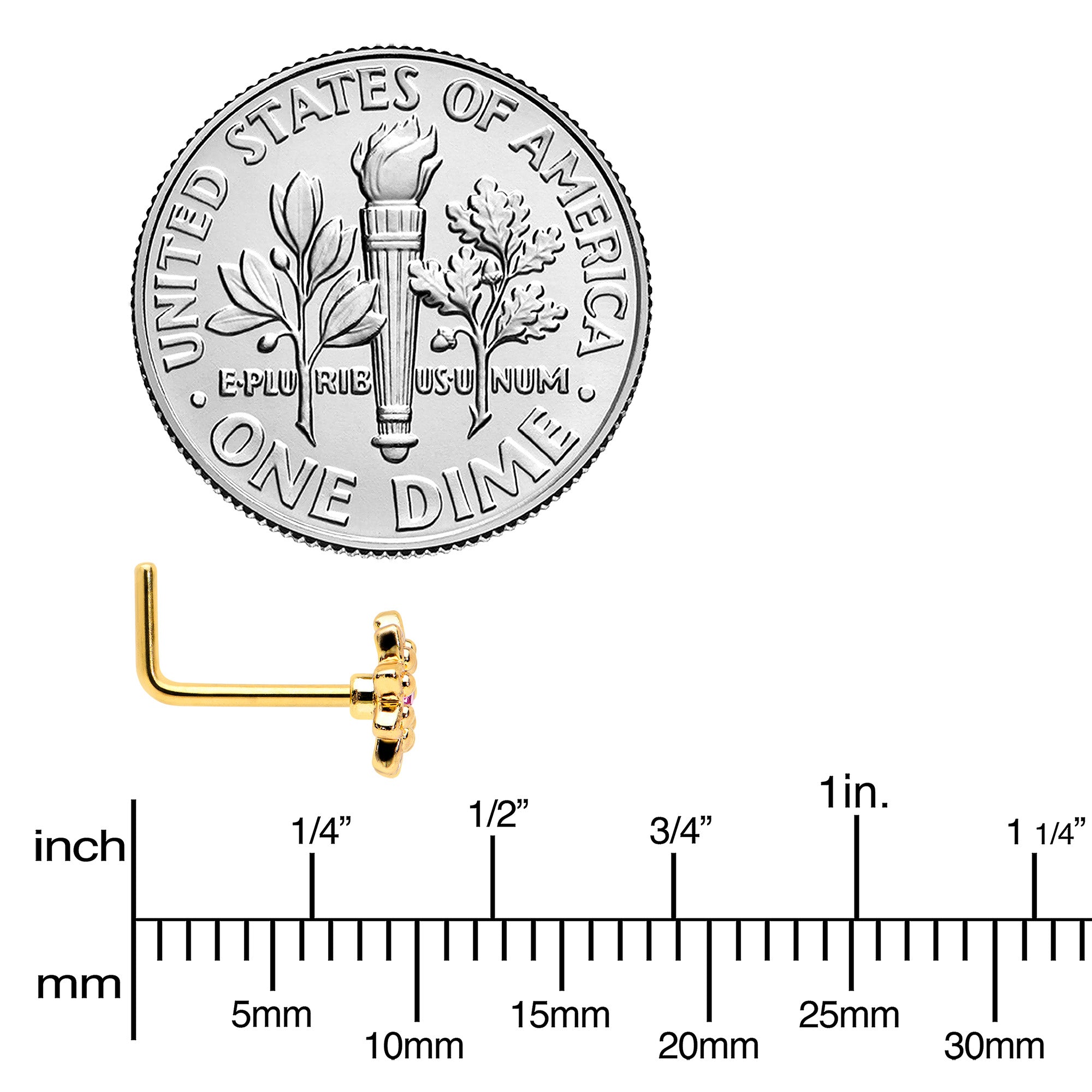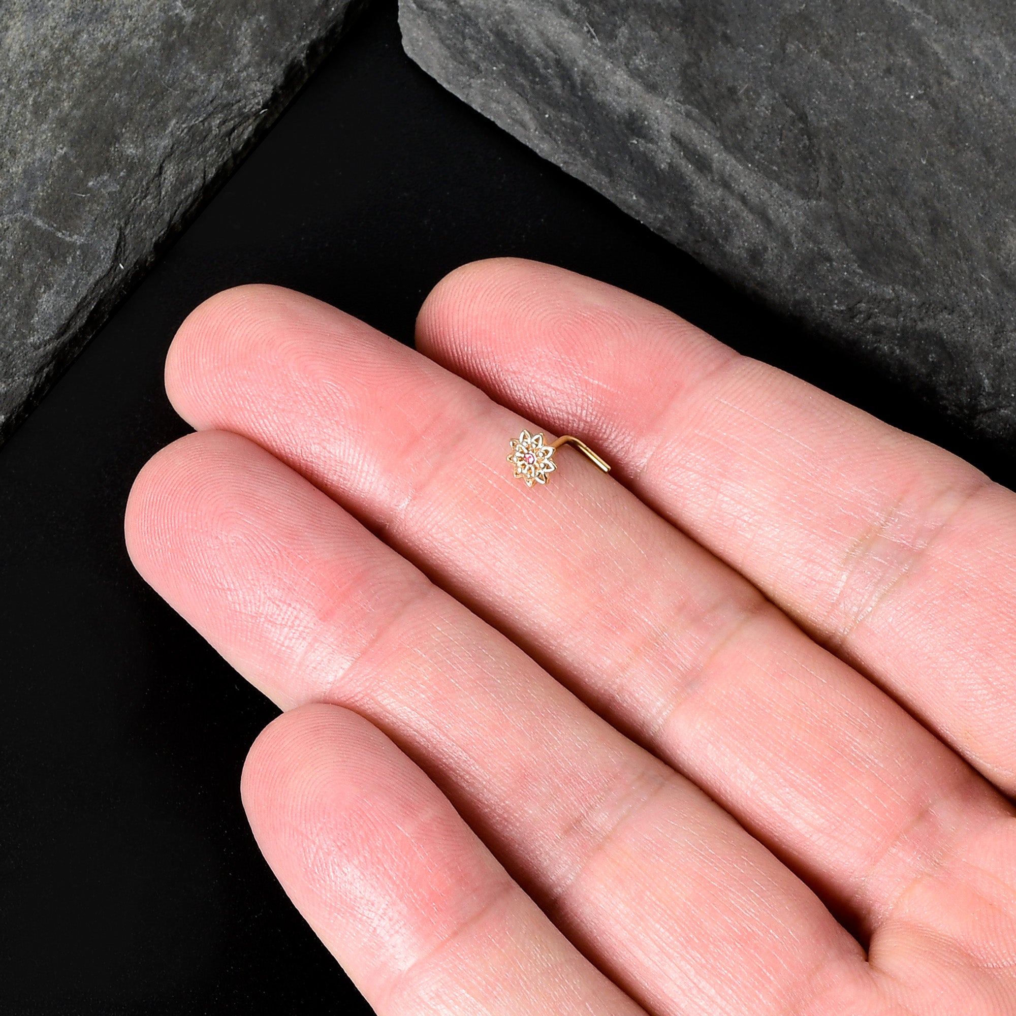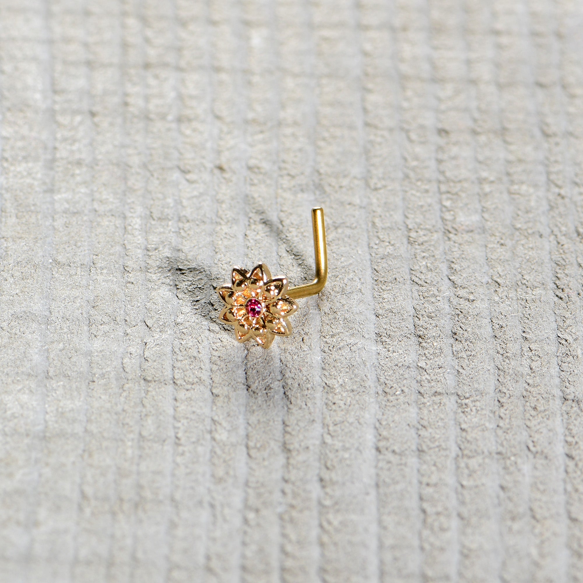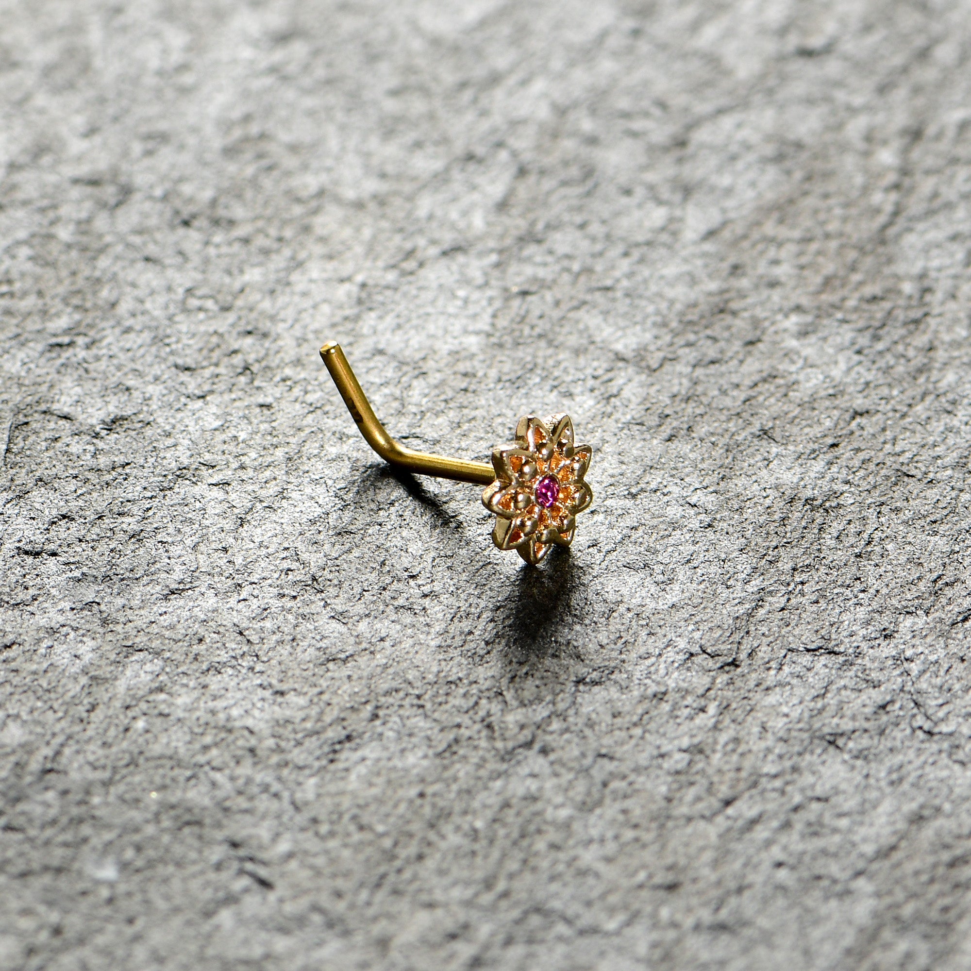 Some flowers are meant to be stars, like this 20 gauge nostril ring! It's made with a .27" length at the bend gold tone PVD over 316L surgical grade stainless steel L-shaped post. It features a detailed flower charm, with petals featuring textured detailing and the flower is set at the center with a pink gem for stunning color contrast. Let your piercings bloom like the stars they are when you're rocking this striking starry flower nose piercing jewelry.