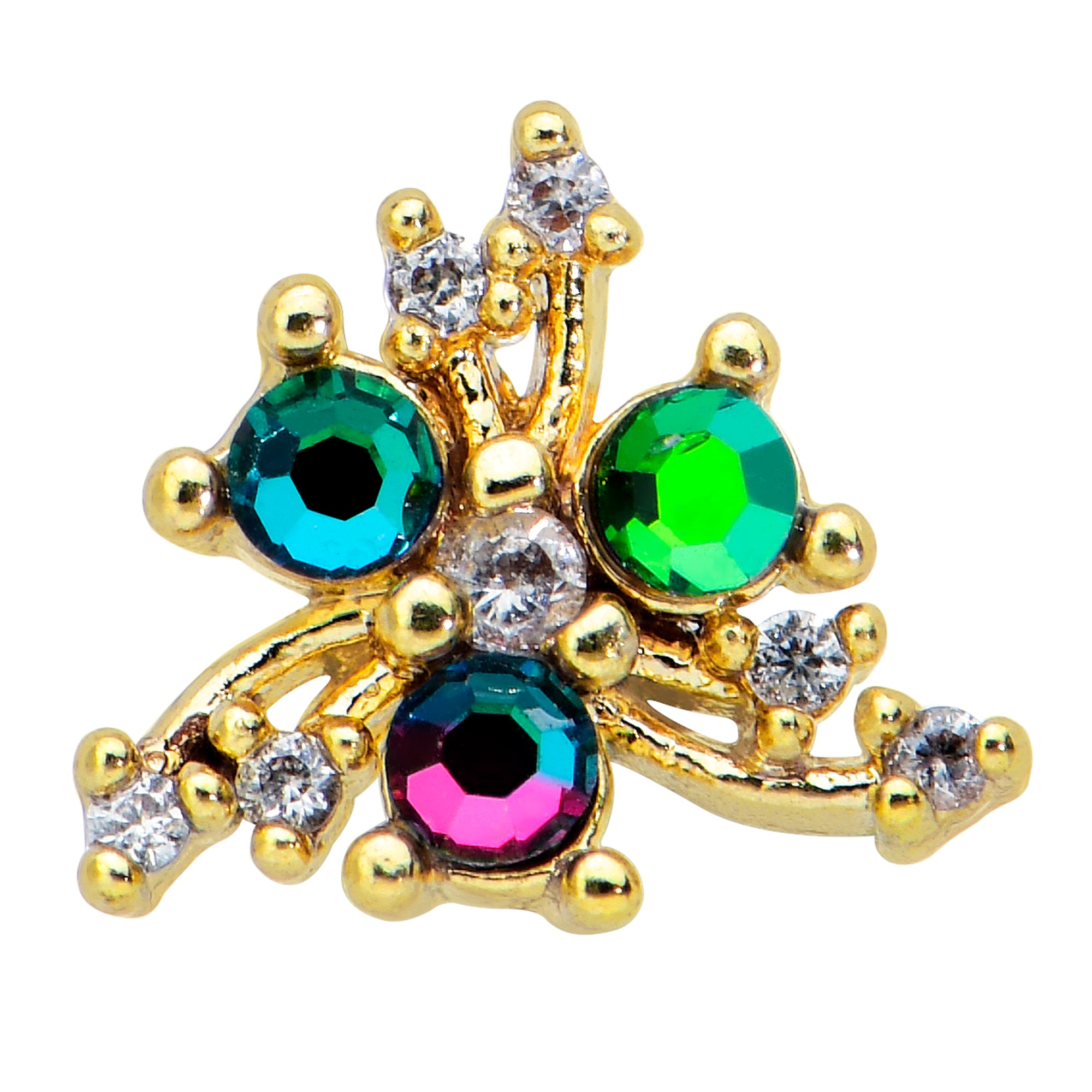 The abstract floral spray on this 20 gauge nostril ring is absolutely eye-catching! It's made with a .27" length at the bend 316L surgical grade stainless steel L-shaped post. It features a trio of round purple tourmalines. They're set among lines of clear cubic zirconias going off in different directions like a spray of flowers. You're sure to feel the spray when you're rocking this elegant, abstract nose piercing ring!