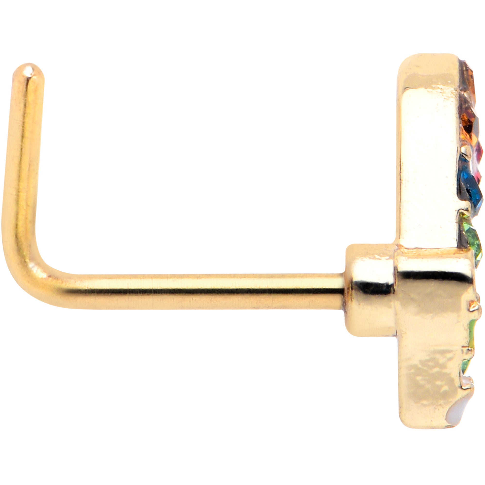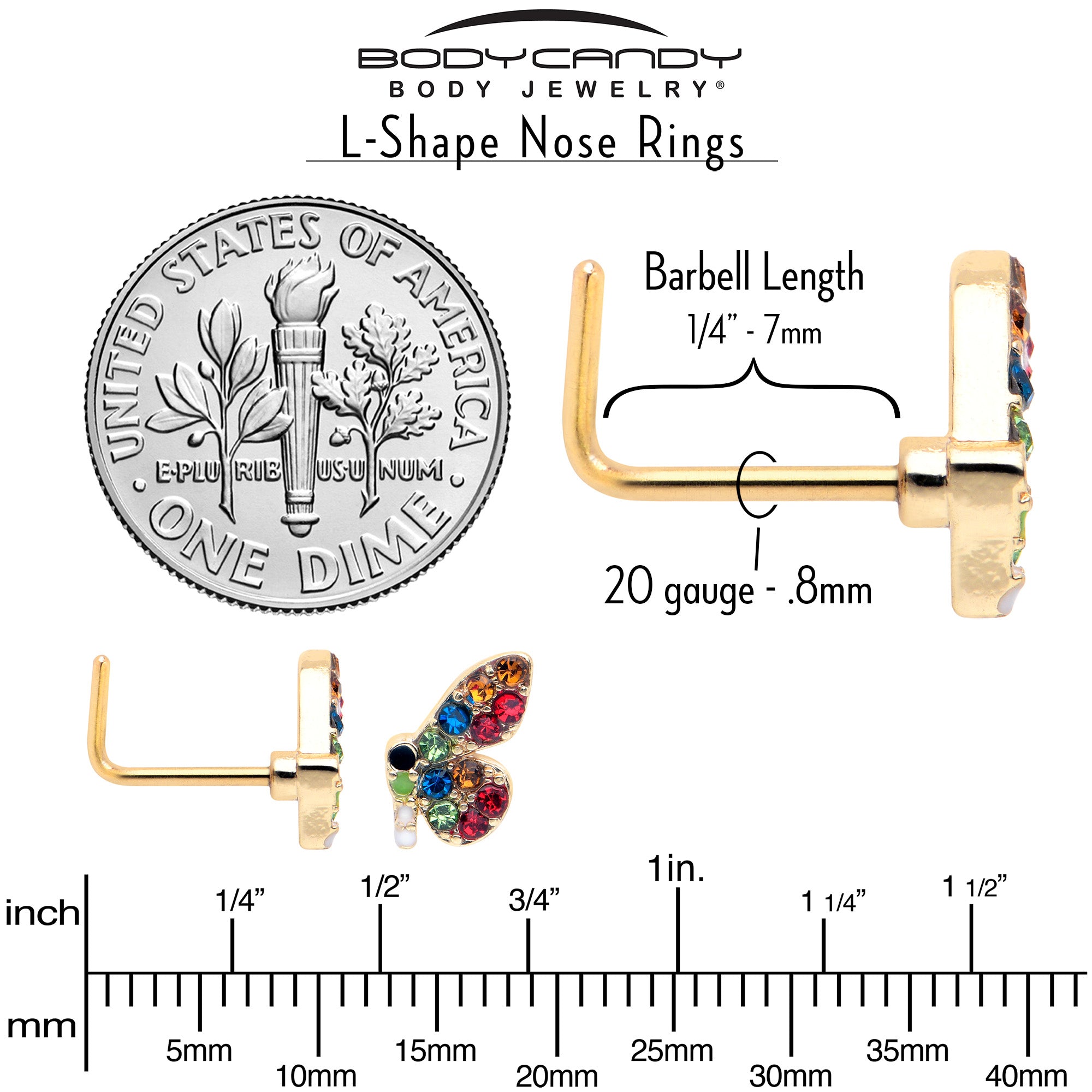 The colorful butterfly on this 20 gauge nostril ring is going to steal your heart. It is made with a 0.27 inch length at the bend gold tone PVD over 316L surgical grade stainless steel L-shaped post. It features a butterfly charm, embellished with multicolor gems for a truly glam style. The overall look is colorful, unique, and truly eye-catching. This is some nose piercing jewelry that will be in your heart forever.