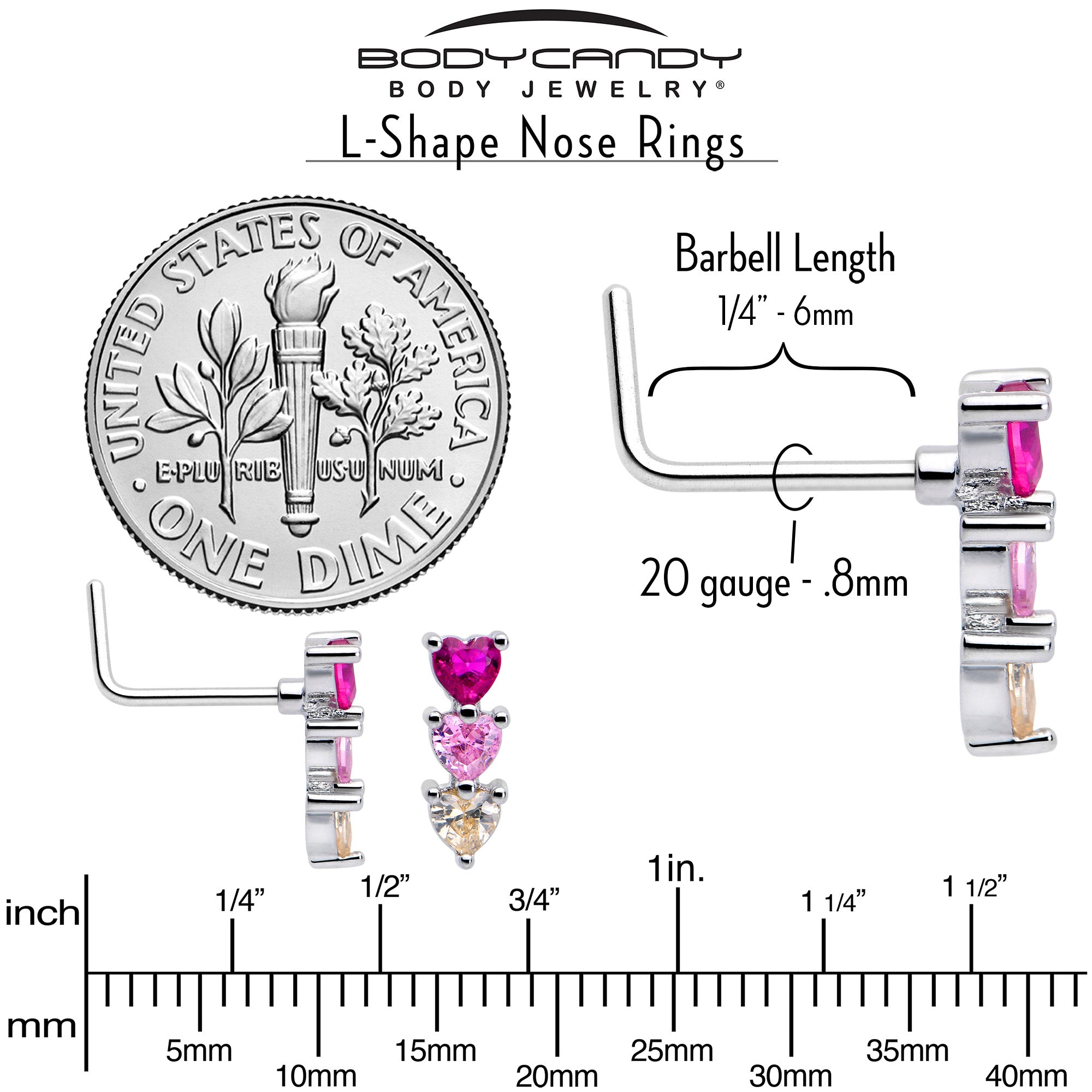 20 Gauge 7mm Red Pink CZ Gem Stacked Heart Trio L Shape Nose Ring