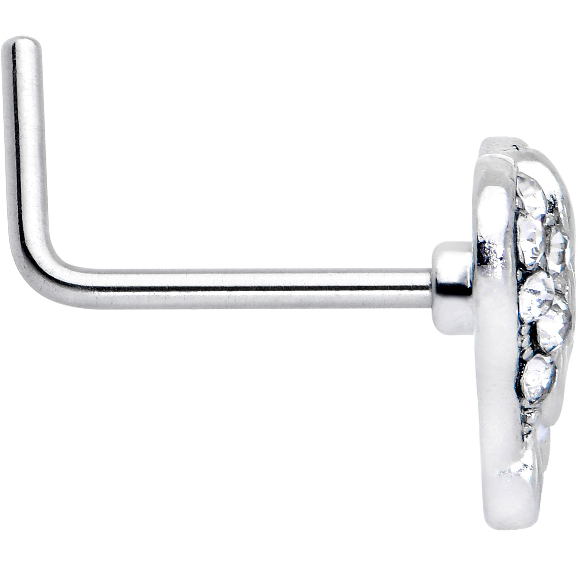Give yourself a heavenly new look with this 20 gauge nostril ring. It's made with a 0.27 inch length at the bend 316L surgical grade stainless steel L-shaped post. It features a heart shaped charm featuring an angel's wings, with one side paved with clear gems. The other side features white inlay and simply styled feather details. Let your look and your spirit soar with this stylish and spiritual nose piercing jewelry.