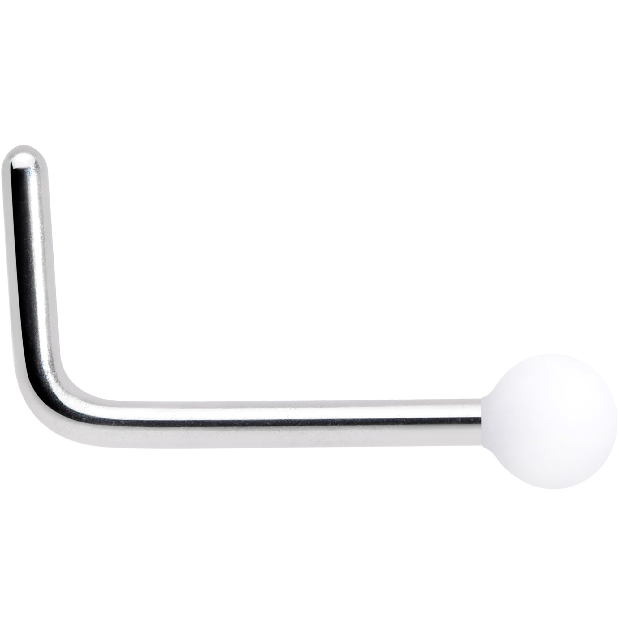 Give your nostril piercing a touch of color with an understated effect with this 20 gauge nose ring! It's made with a 7mm length at the bend 316L surgical grade stainless steel L-shaped post for easy insertion and removal, as well as comfort. The other end features a 2mm white matte ball end. If you want a look that won't get lost in the crowd or overwhelm your style, this elegant black nose jewelry is exactly what you're after!
