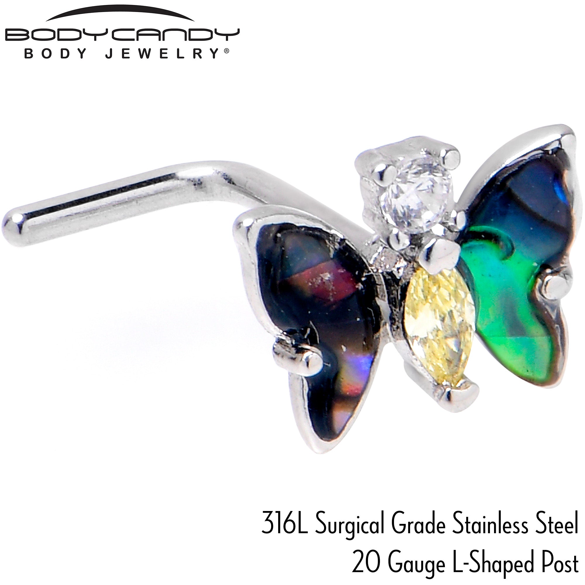 20 Gauge 7mm Yellow Clear Gem Dark Butterfly L Shape Nose Ring