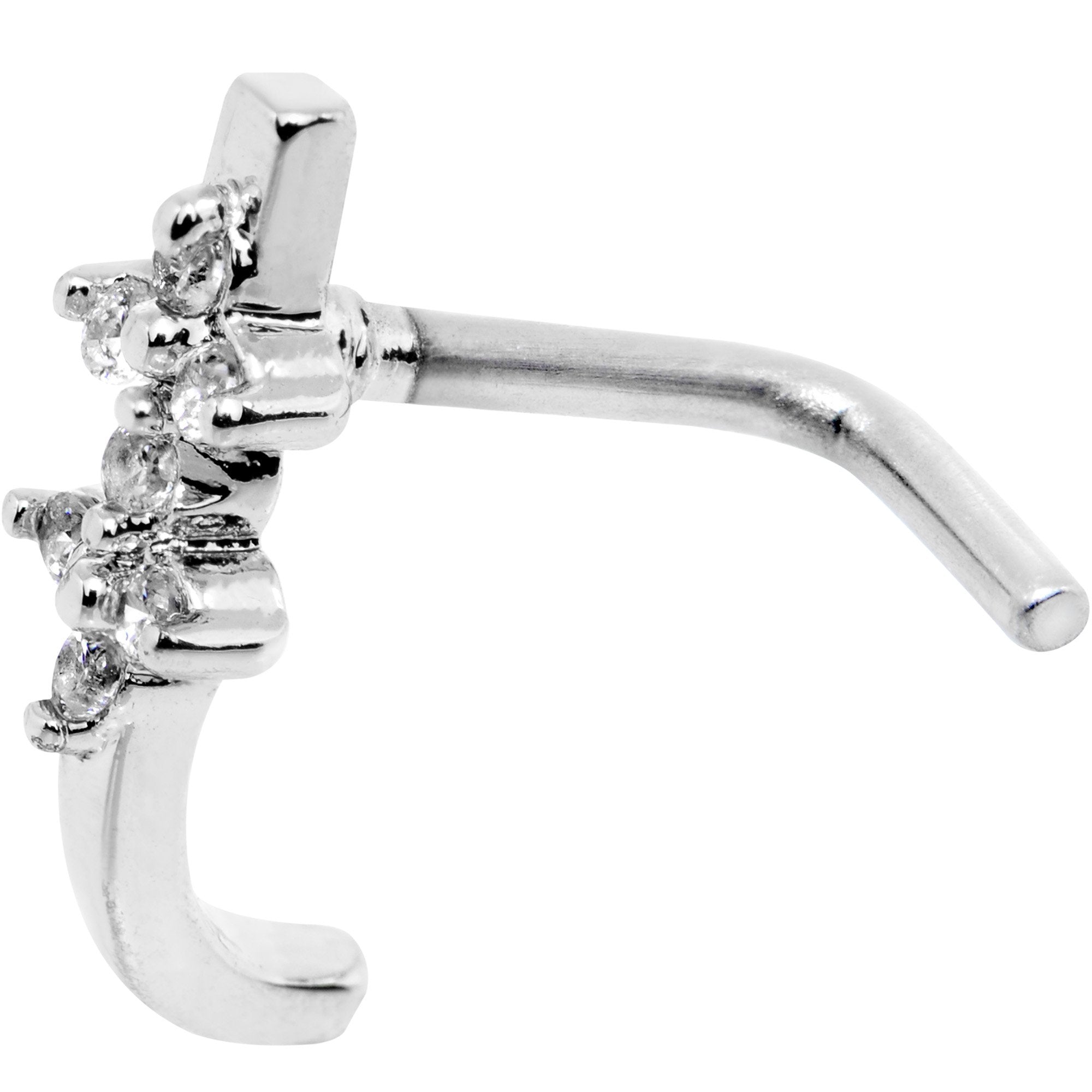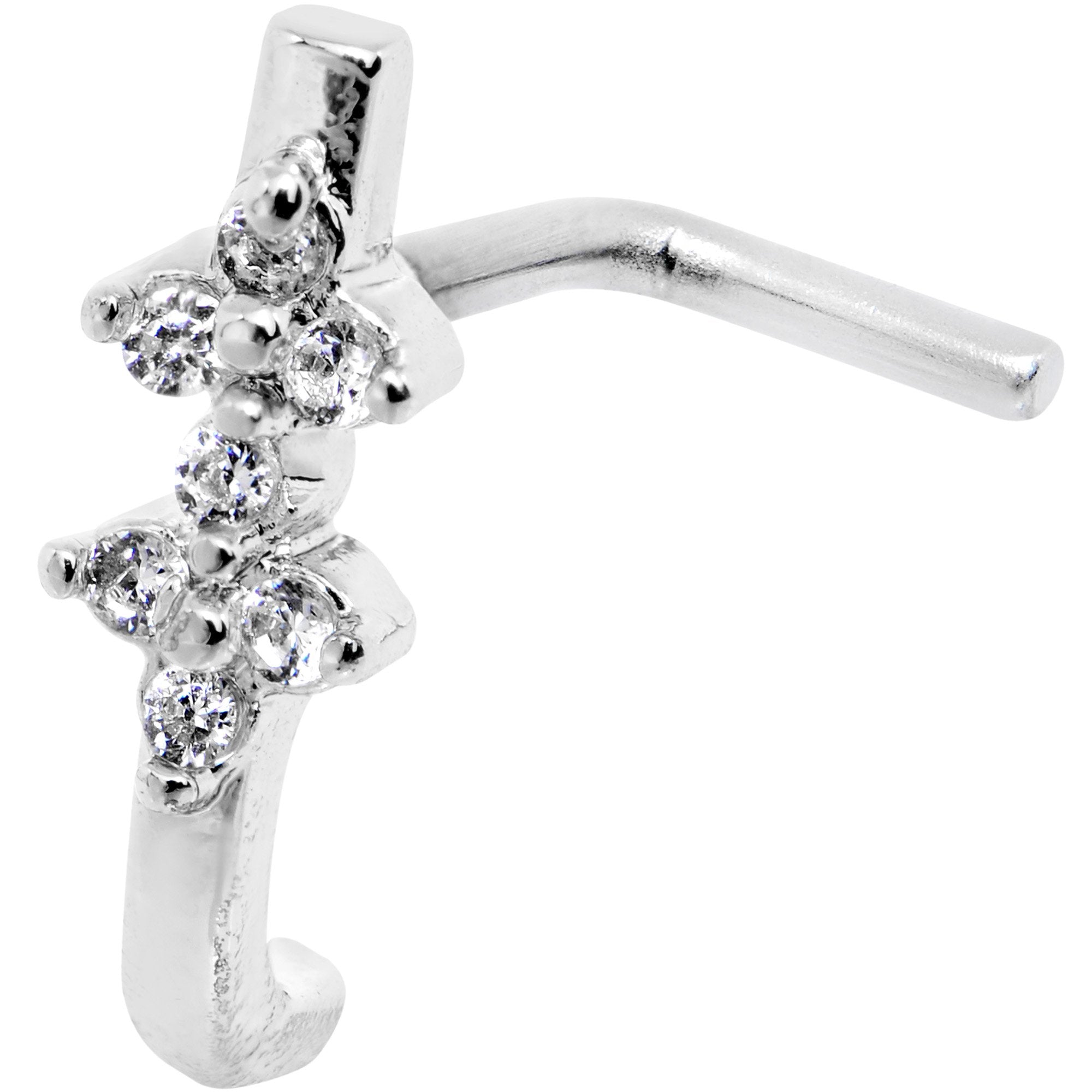 Embrace a lovely look for your nose piercing when you wear this 20 gauge nose ring that looks like a hoop! Made with a 6mm length at the bend durable 316L surgical grade stainless steel L-shaped post, this nostril piercing features a half hoop set with clear cubic zirconia gems that wraps around the nose and sits outside of your nostril to give the illusion of a hoop in your regular (pierced!) piercing without actually wearing one at all. Try something new; this interesting nose jewelry may be right for you!