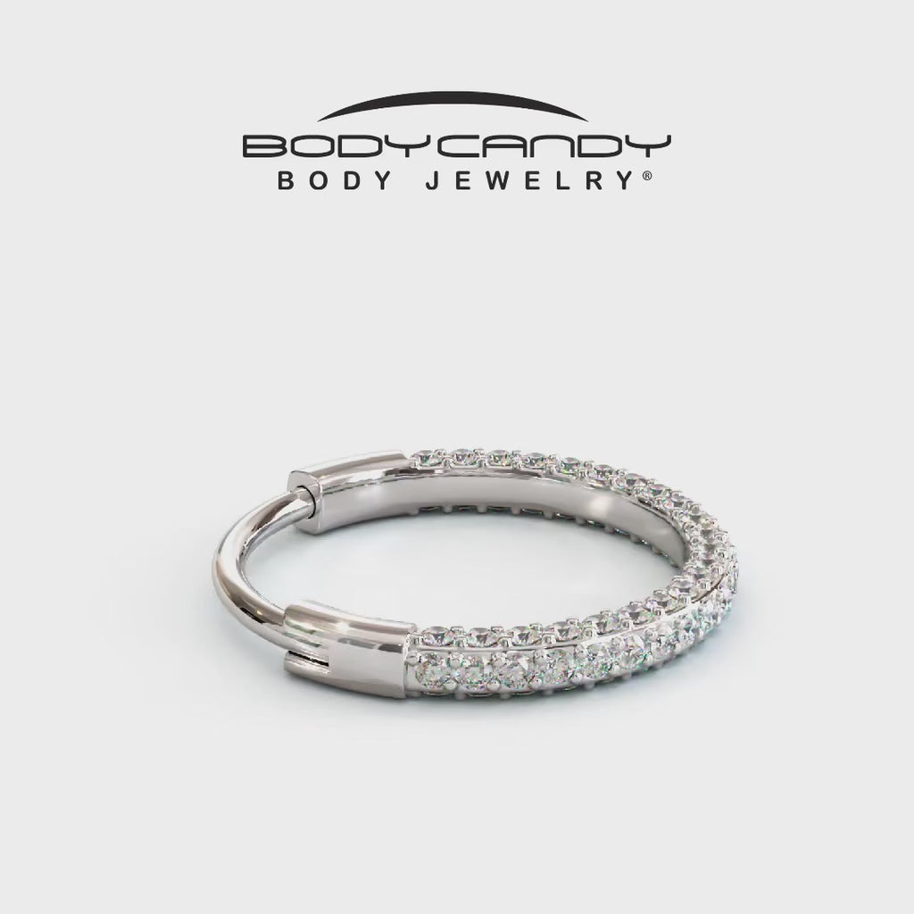 Add a look of sophistication to your nose piercing or ear with this 20 gauge implant grade titanium hinged nose ring piercing! The bottom arc of this 8mm tragus ring is paved with cubic zirconia gems on both the front and sides of the hoop for a look that's totally attention-getting without being over-the-top.