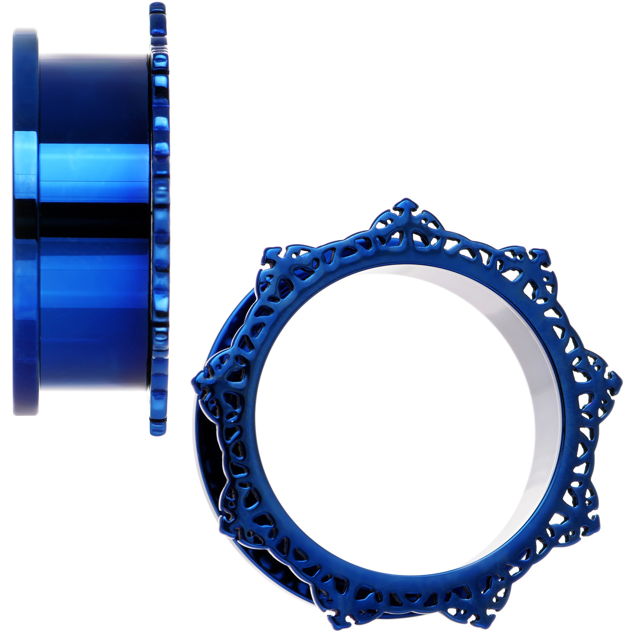 Be bold and vibrant with this set of 25mm tunnel plugs featuring a blue PVD over 316L surgical grade stainless steel design of beautiful and intricate filigree framework at the front face of each plug. These screw fit plugs are sold as a pair, so each set contains a total of two tunnel plugs to adorn your stretched ear lobes.