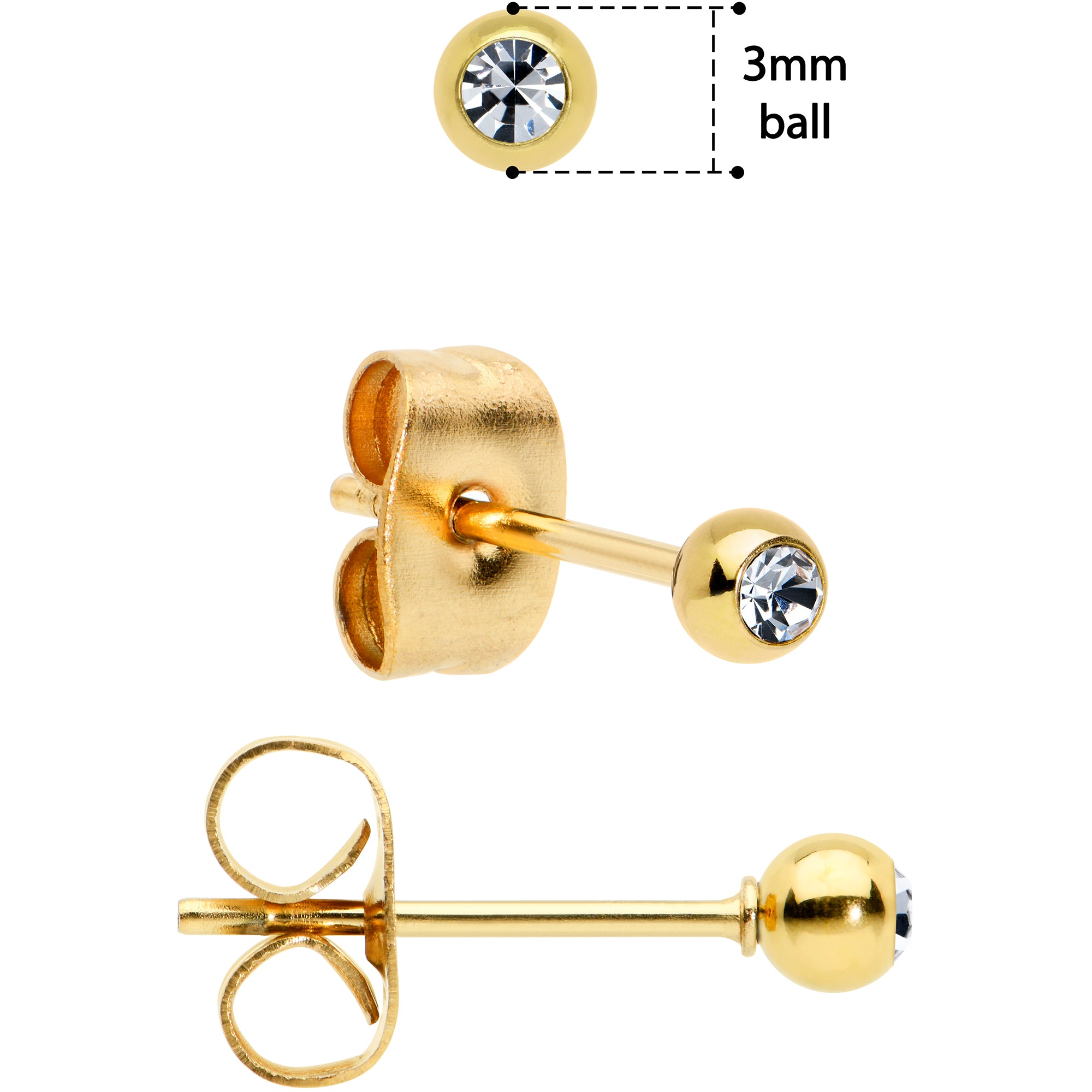3mm 4mm 5mm Clear Gem Gold Tone Ball 316L Steel Stud Earrings 3 Pack