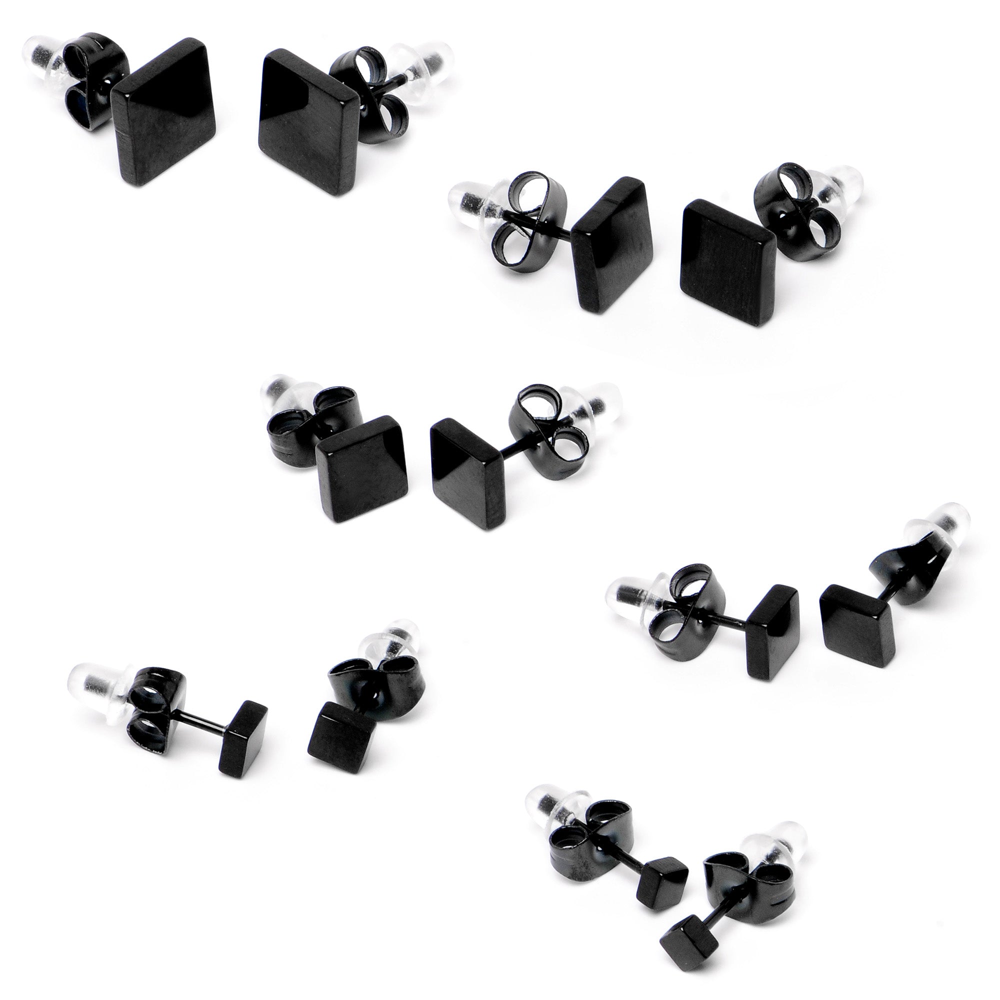 3mm-8mm Square Stud Black 316L Stainless Steel Earrings 6 Pack