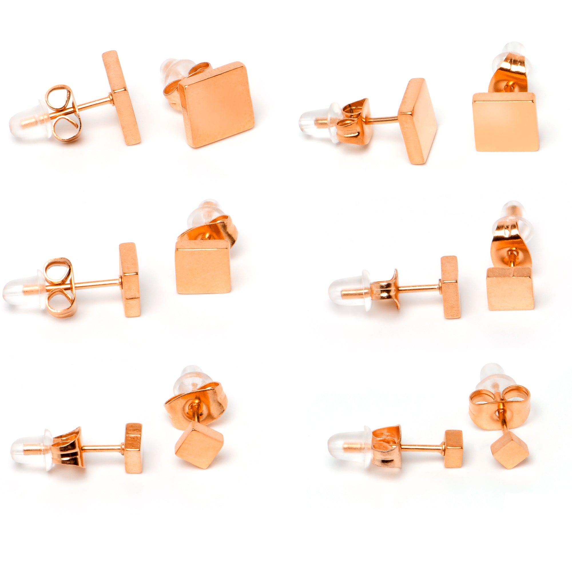 3mm-8mm Square Stud Rose Gold Tone 316L Stainless Steel Earrings 6 Pack