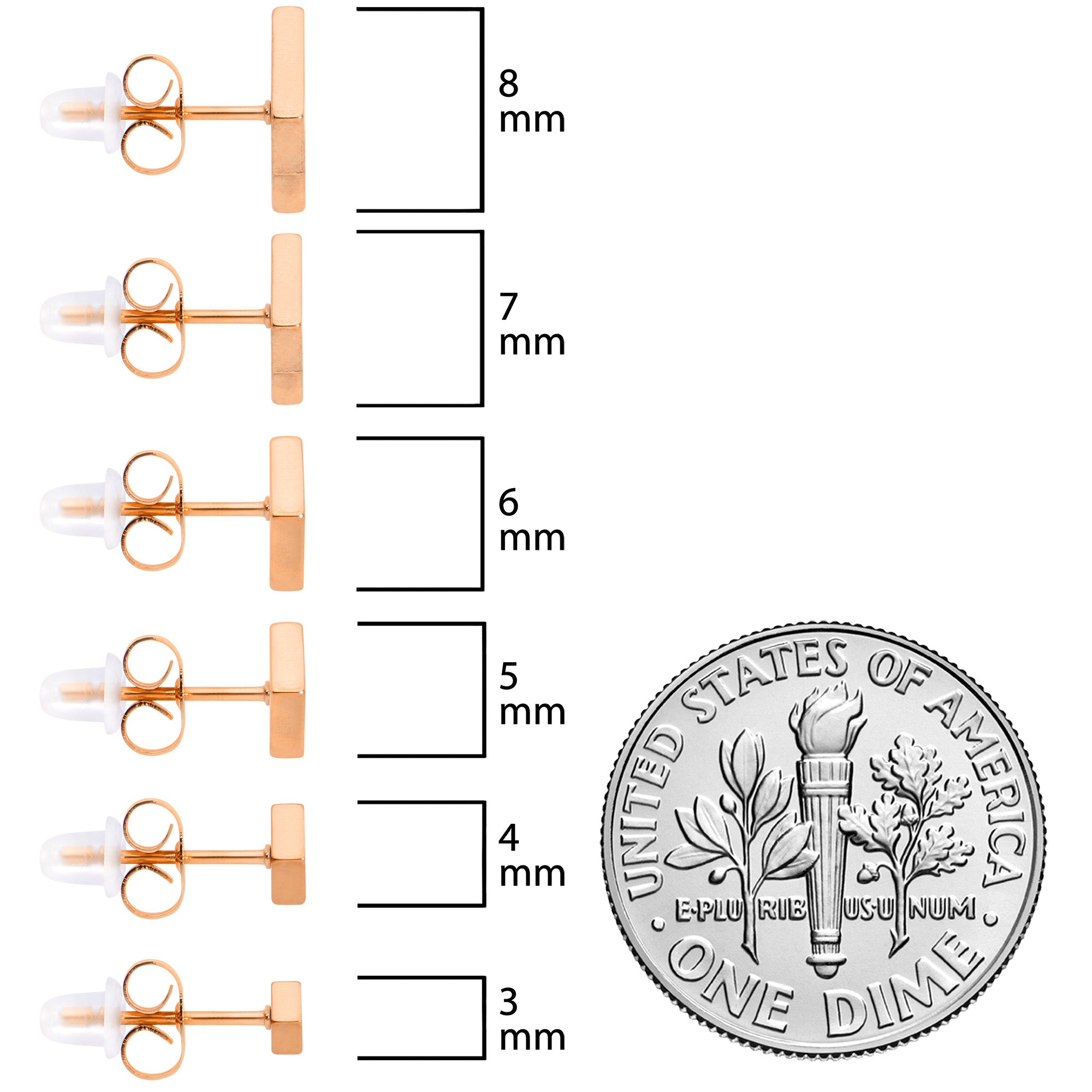 If you are looking for classic style that goes with everything, these 20 gauge earrings will have you ready for any occasion. They are made with rose gold tone PVD over 316L surgical grade stainless steel straight posts and have butterfly-style friction backs for a secure fit. They feature simple square ends with subtle style that will not overwhelm. You get one pair each in 3mm, 4mm, 5mm , 6mm, 7mm, and 8mm for a touch of classic chic to go with every look. These are sure to add some simple elegance to your pierced lobes. Sold as a set of six.