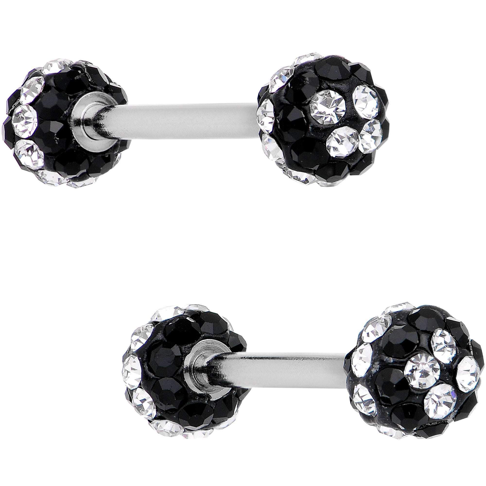 Prepare for a sparkling blast of color! These simple yet eye catching 14 gauge nipple barbells feature a brilliant cluster of two tone sparkling gems. These fun 14mm in length nipple barbells are made with durable 316L surgical grade stainless steel straight barbells and feature 5mm ball ends encrusted in black and clear cubic zirconia gems, forming a stripe design. Sold as a set of two for you!
