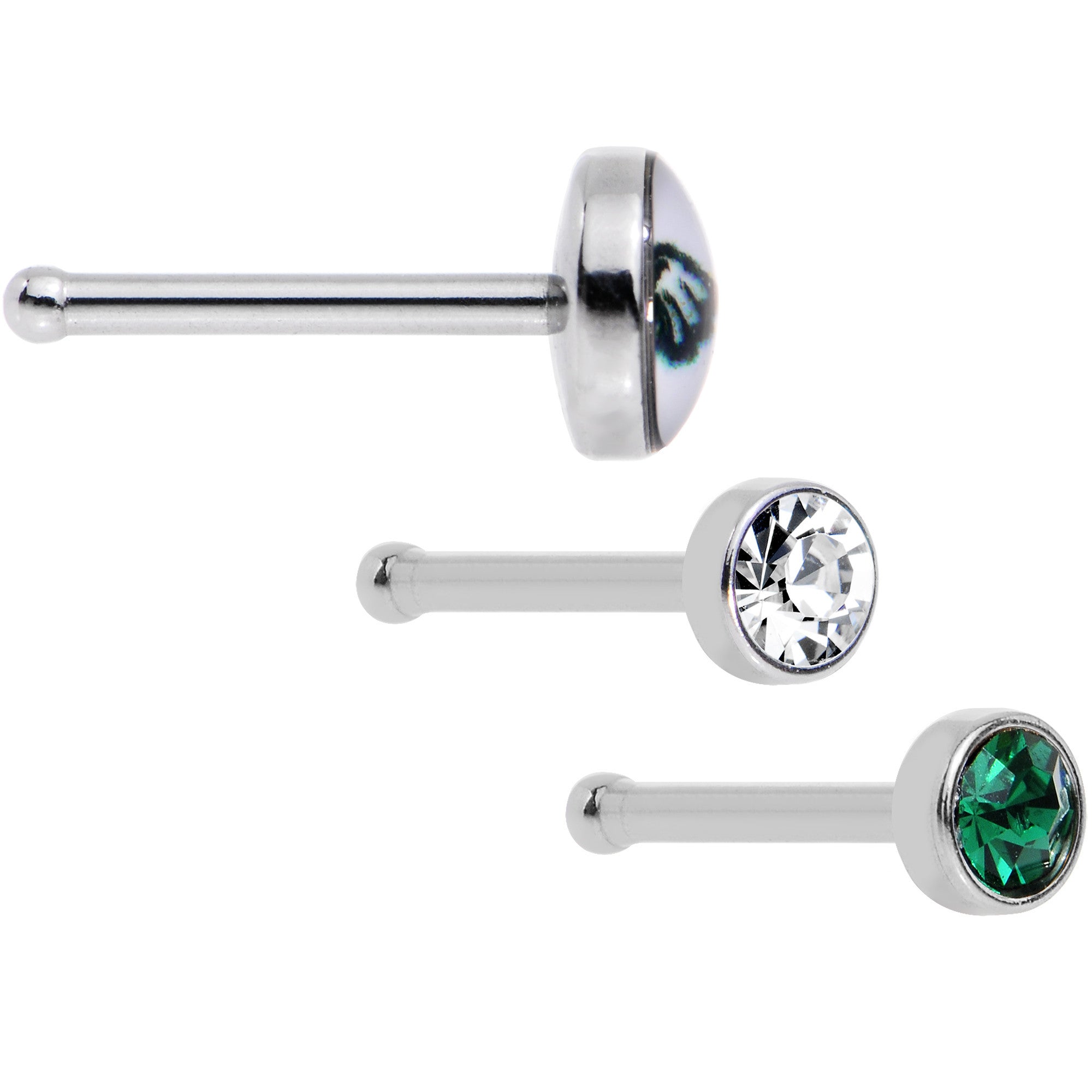 Looking for nose jewelry style that shows off your love for the all-American game of football? Well, we've got you covered with this pack of three officially licensed NFL 20 gauge nose studs! Made with 6mm length durable 316L surgical stainless steel straight posts, these nose bones are perfect for switching your style. This set of 3 licensed Philadelphia Eagles football nose rings features a Philadelphia Eagles logo stud design along with a choice of clear and green gem studs for when bling is the thing for high-scoring style!