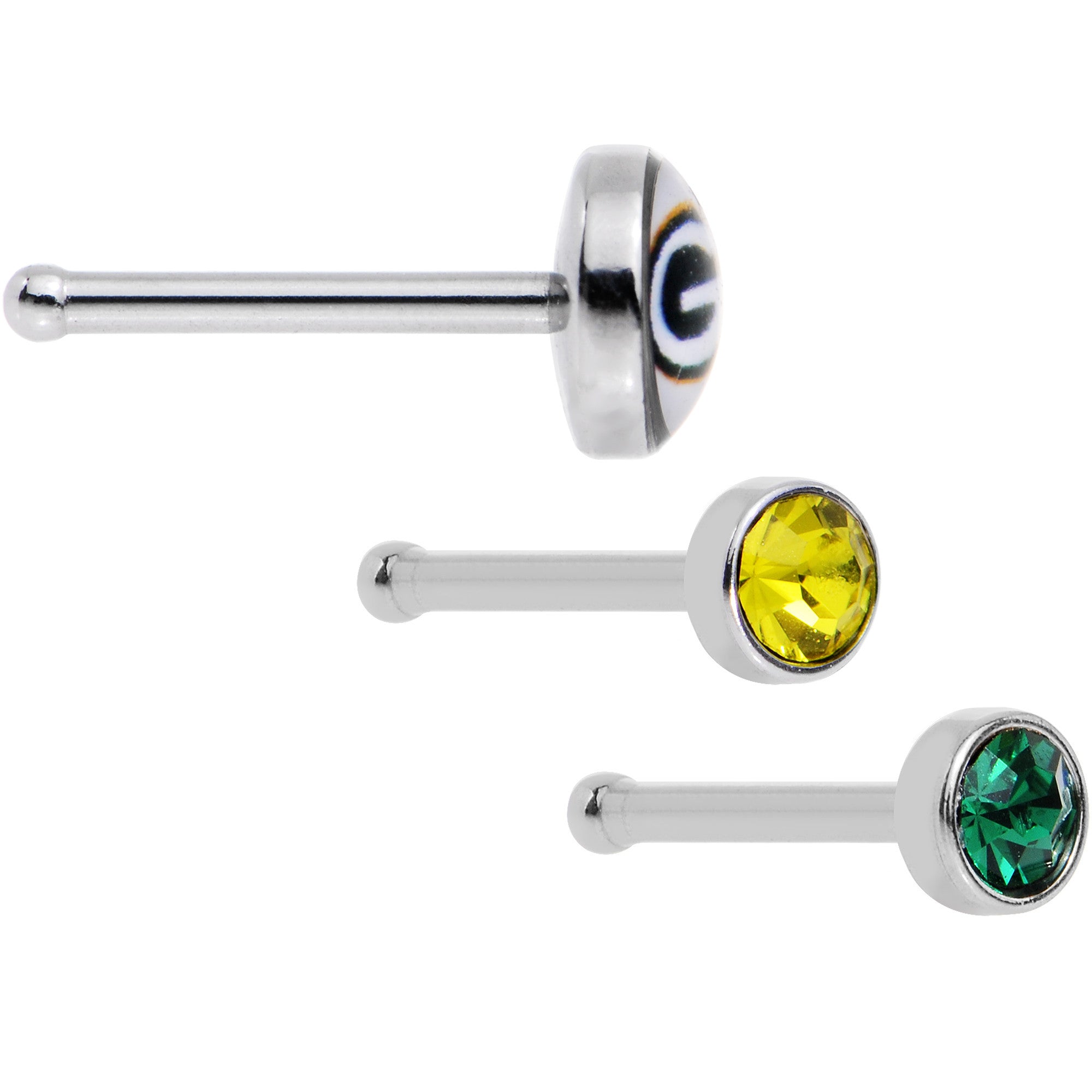 Looking for nose jewelry style that shows off your love for the all-American game of football? Well, we've got you covered with this pack of three officially licensed NFL 20 gauge nose studs! Made with 6mm length durable 316L surgical stainless steel straight posts, these nose bones are perfect for switching your style. This set of 3 licensed Green Bay Packers football nose rings features a Green Bay Packers logo stud design along with a choice of yellow and green gem studs for when bling is the thing for high-scoring style!