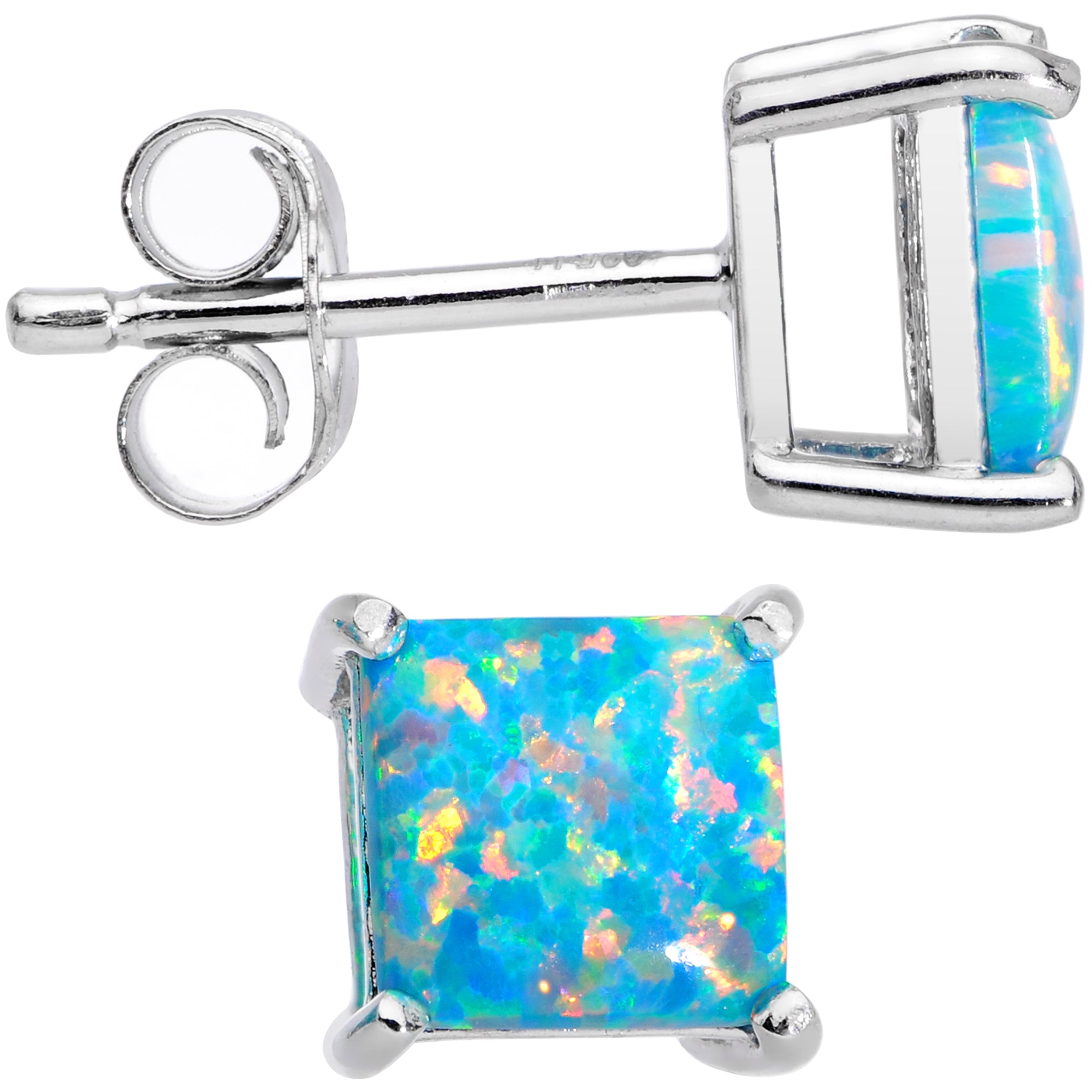 6mm synthetic opal earrings with timeless style and are alluring with their delightful play of iridescent colors. Classic square opal earrings. These sterling silver stud earrings feature a basket setting with post friction backs.