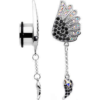 Show the world that you are always in an angelic state of mind when you wear this pretty pair of single flare plugs. Made with durable 316L surgical grade stainless steel, these 14mm ear gauges feature an angel's wing set with a series of aurora and black gems with matching wing dangles, come with rubber o-rings for secure wear, and are sold as a set of two. Whether you are always an angel or love a little dramatic flair this set of dangle ear plugs is perfect for you.