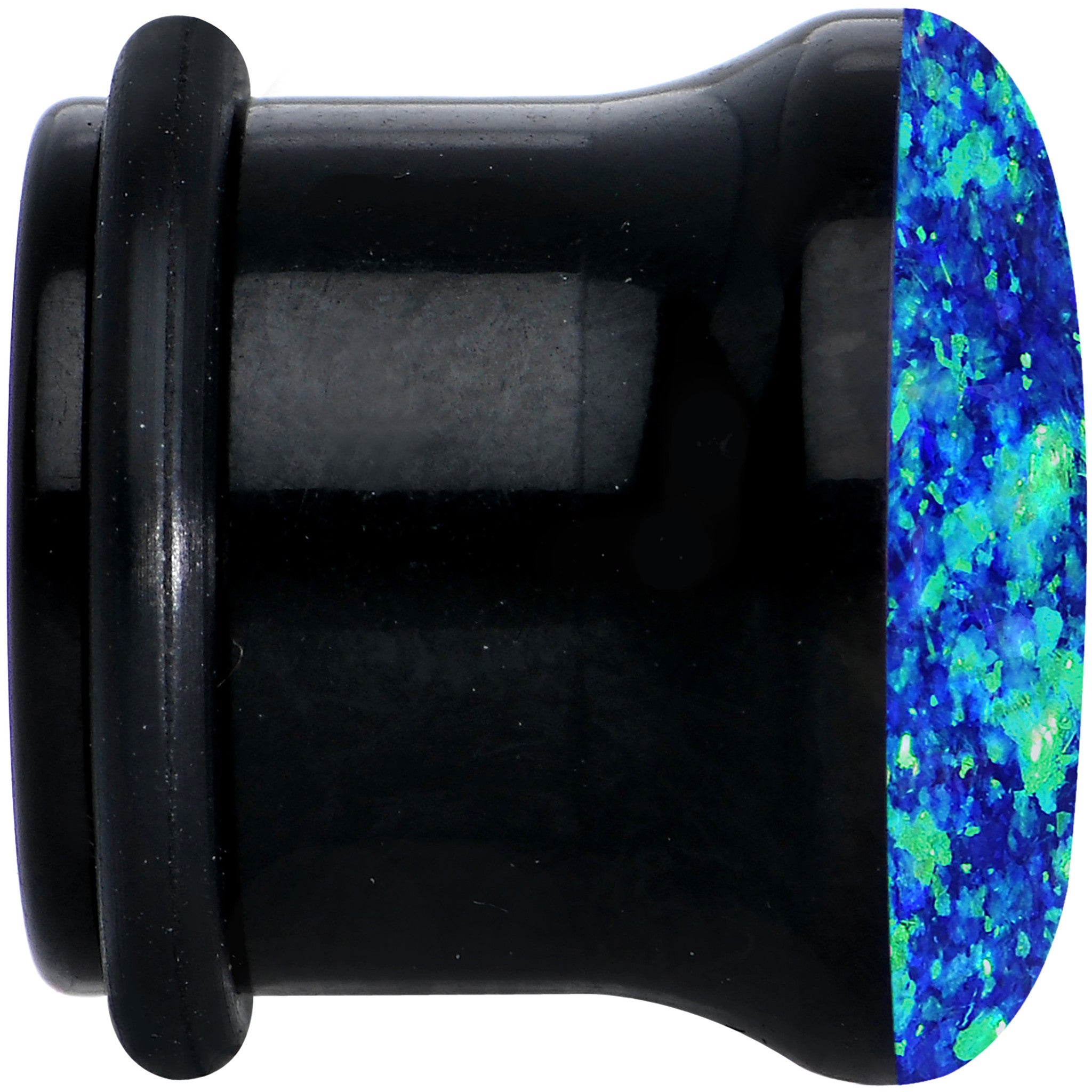 Item sold individually, purchase two for a pair. It's always a party when this cool acrylic ear expander plug comes out. A riot of blue opalescent glitter on the front of the black single flare plug creates a great contrast. The 14mm ear stretcher comes with one rubber O-ring. Pierced body jewelry ear gauge plug.