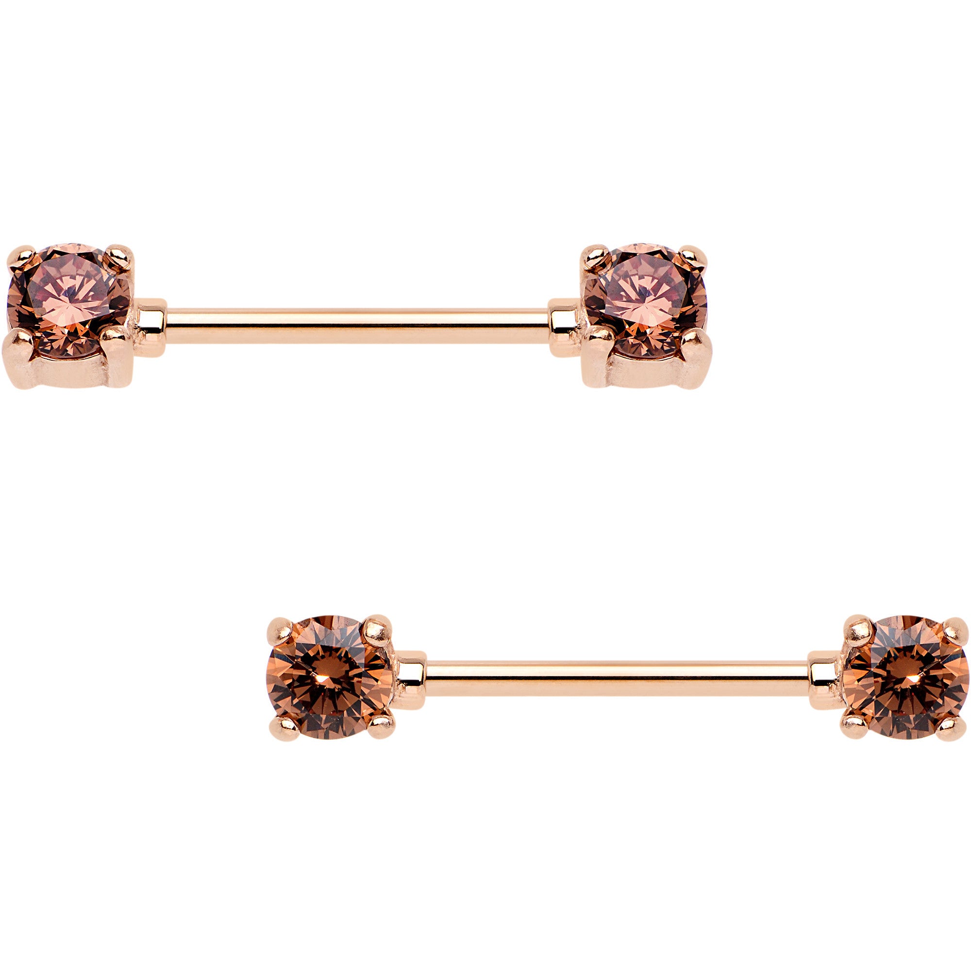 Simple yet elegant, these pretty, traditional style nipple barbells are understated and unique. The sparkling brown gem ends perfectly compliment the rose gold color of the barbells. The brown gems are mounted on a pronged 9/16" straight barbell made with rose gold tone anodized over 316L surgical grade stainless steel. Feel as classy as you are with these pretty nipple piercings! Sold as a set of two.