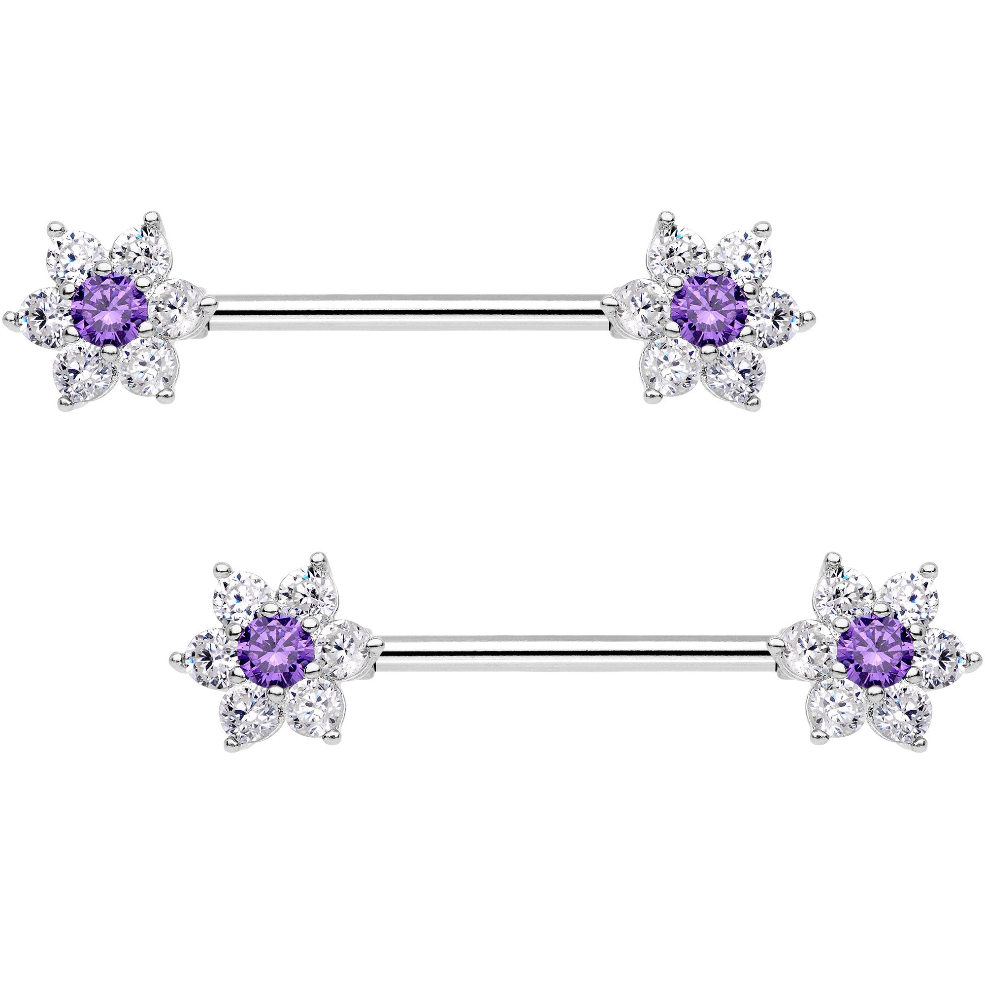 Dress up your breasts with the essence of floral fashion with these sparkling barbell nipple rings. These 14 gauge nipple piercings feature clear gem encrusted flower charms with a shimmering purple cubic zirconia gem at its center. The flower charms are mounted on 14mm straight barbells made with durable 316L surgical grade stainless steel. Sold as a set of two for you!