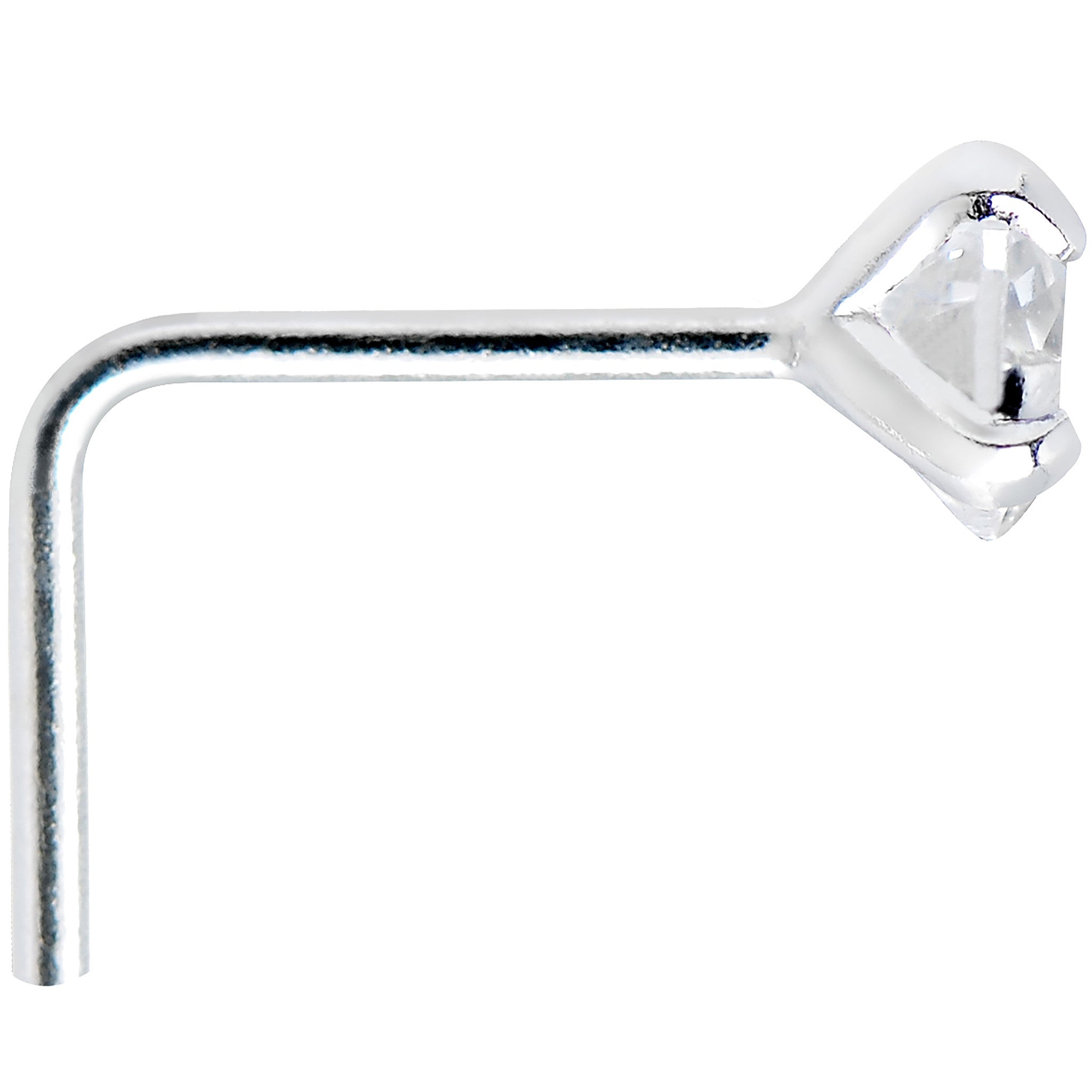 Amazing and bright surgical grade stainless steel L-shaped nose ring features a 3mm prong set clear cubic zirconia that brings a sparkle to your look that never quits. Cubic zirconia nose ring.