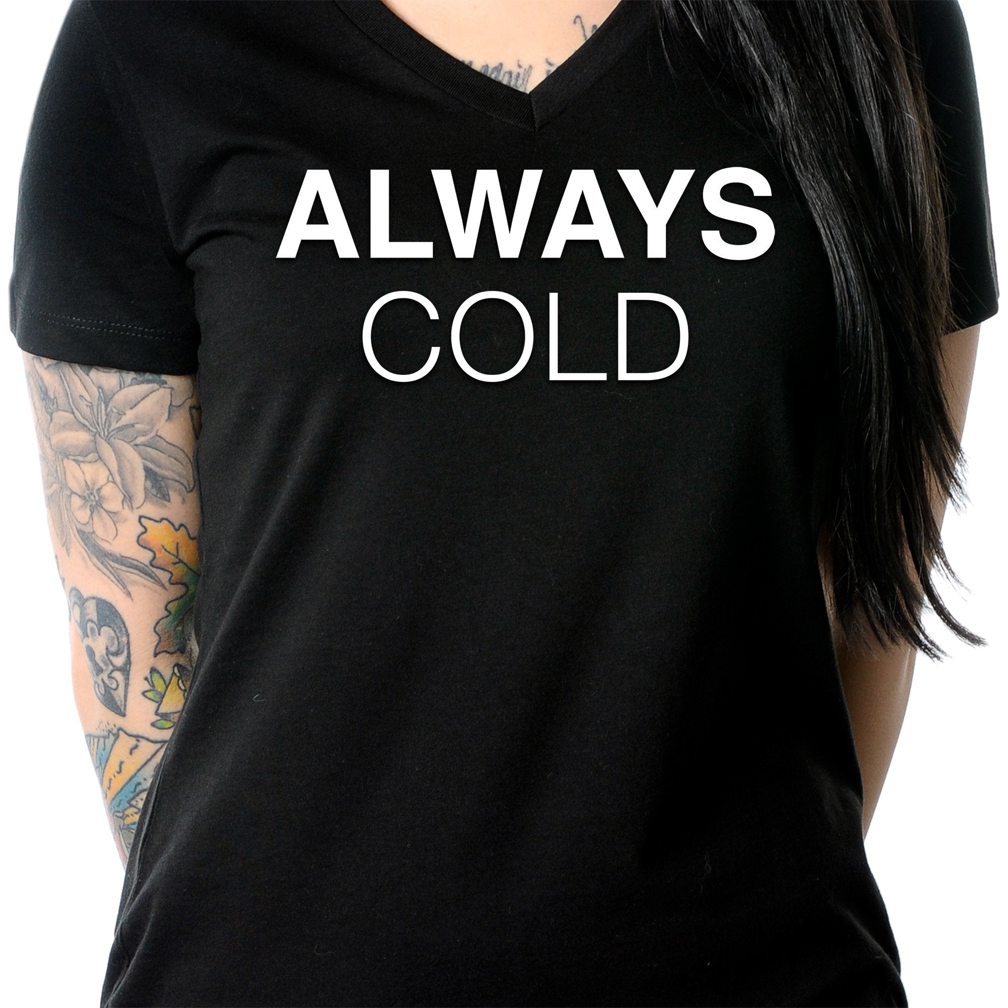 Let the world know that you are never warm whenever you wear Body Candy's comfortable 100% cotton "Always Cold" t-shirt! This 100% ring spun combed cotton tee shirt features a ribbed knit neckline, v-neck shoulder to shoulder taping, and a comfortable fit that will make this cotton t-shirt one of your favorites. It's the perfect tee for a polished look!