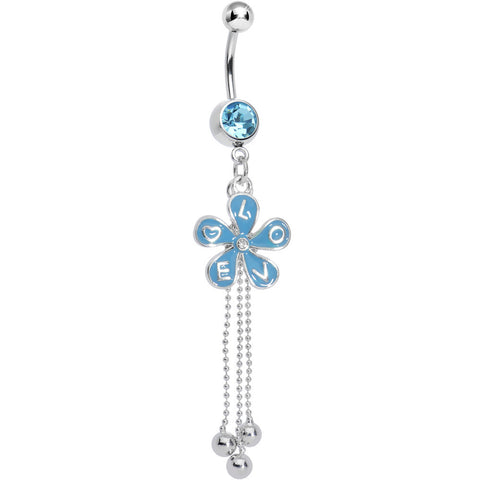 Love is absolutely in bloom with this utterly charming flower belly button ring. The light blue flower petals spell out "Love" with a bonus heart on the fifth petal. An aqua gem barbell and silver tone dangling beads round out the look of a dangling navel ring that's the very embodiment of spring.