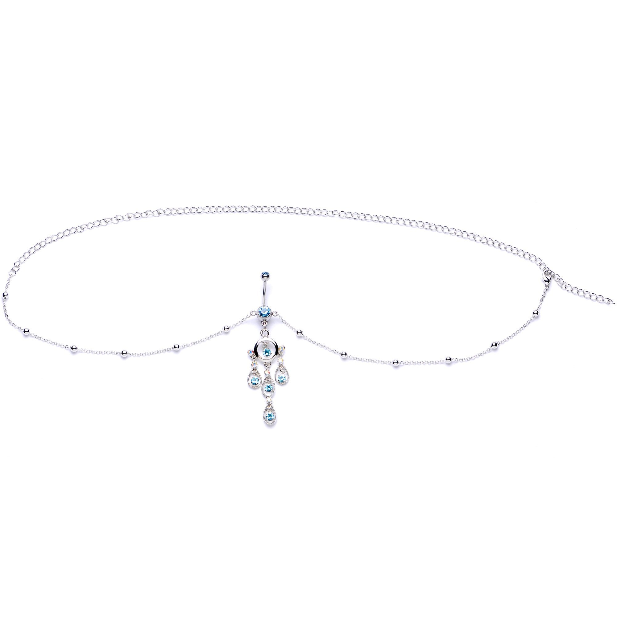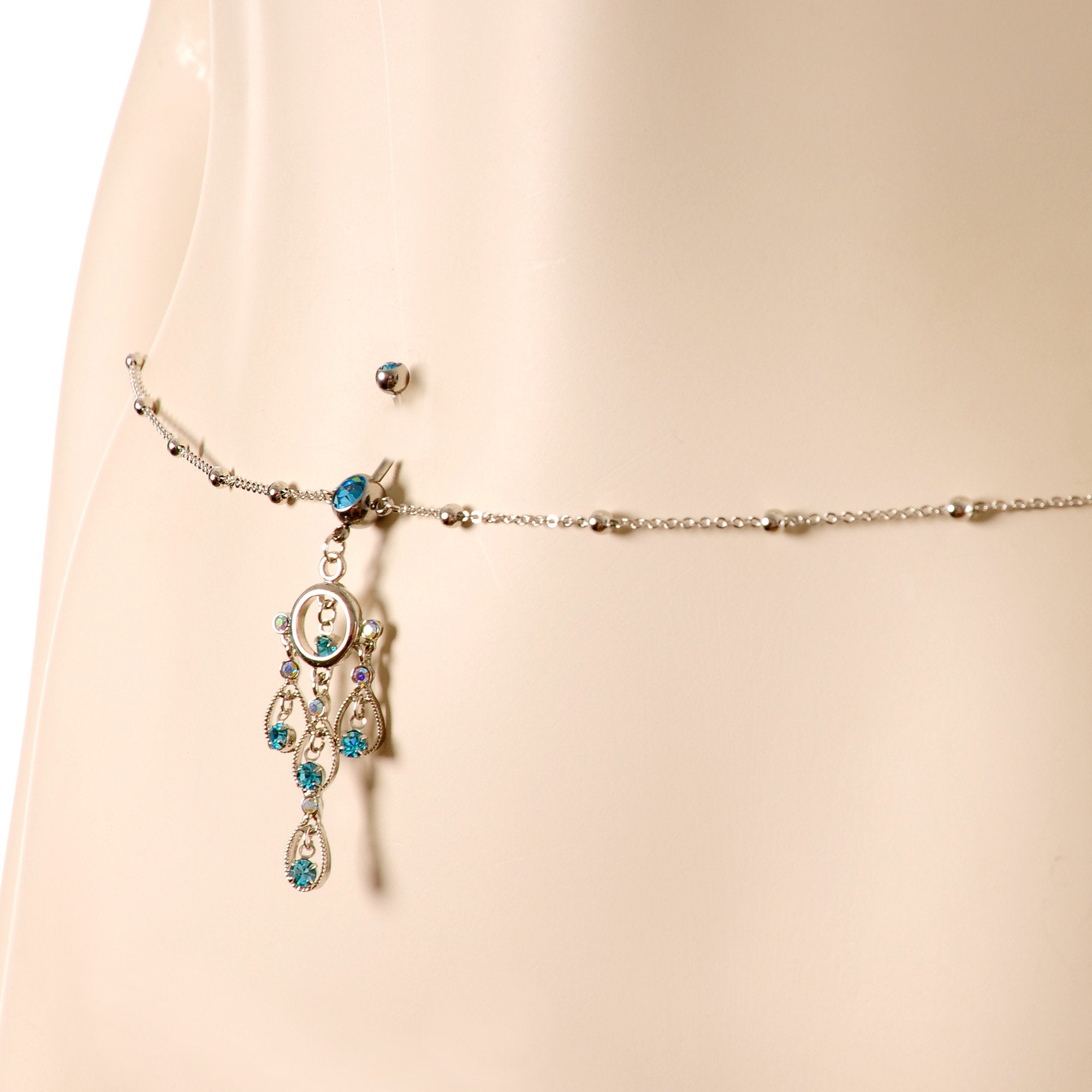 Don't let that midriff or your navel piercing go bare when you wear your favorite halter top or belly shirt. This sexy belly chain jewelry attached to a 14 gauge dangle belly button ring will enhance your waistline and is the perfect fashion accessory for a day at the beach or a night out. Made with a 7/16" durable 316L surgical grade stainless steel curved barbell as well as a 42" chain length, this chandelier style waist belt navel ring features aqua top and bottom gems and a chandelier dangle charm set with aqua and aurora gems. The waist chain features a lobster clasp used to adjust the length to fit your body.