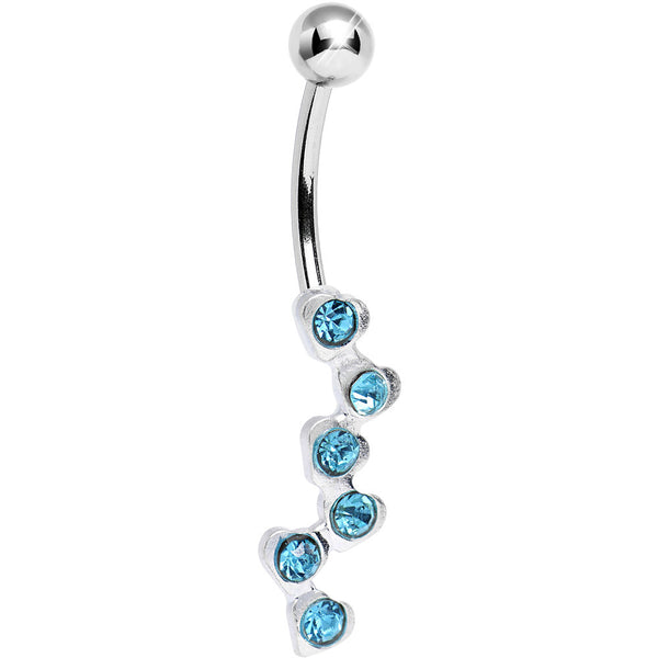 Love showers down and sparkles forever with this dripping heart dangle belly button ring. Aqua gems set inside heart shaped frames cascade down in a flowing line that will shimmer in the sunlight. Navel ring is designed with cozy curved barbell.
