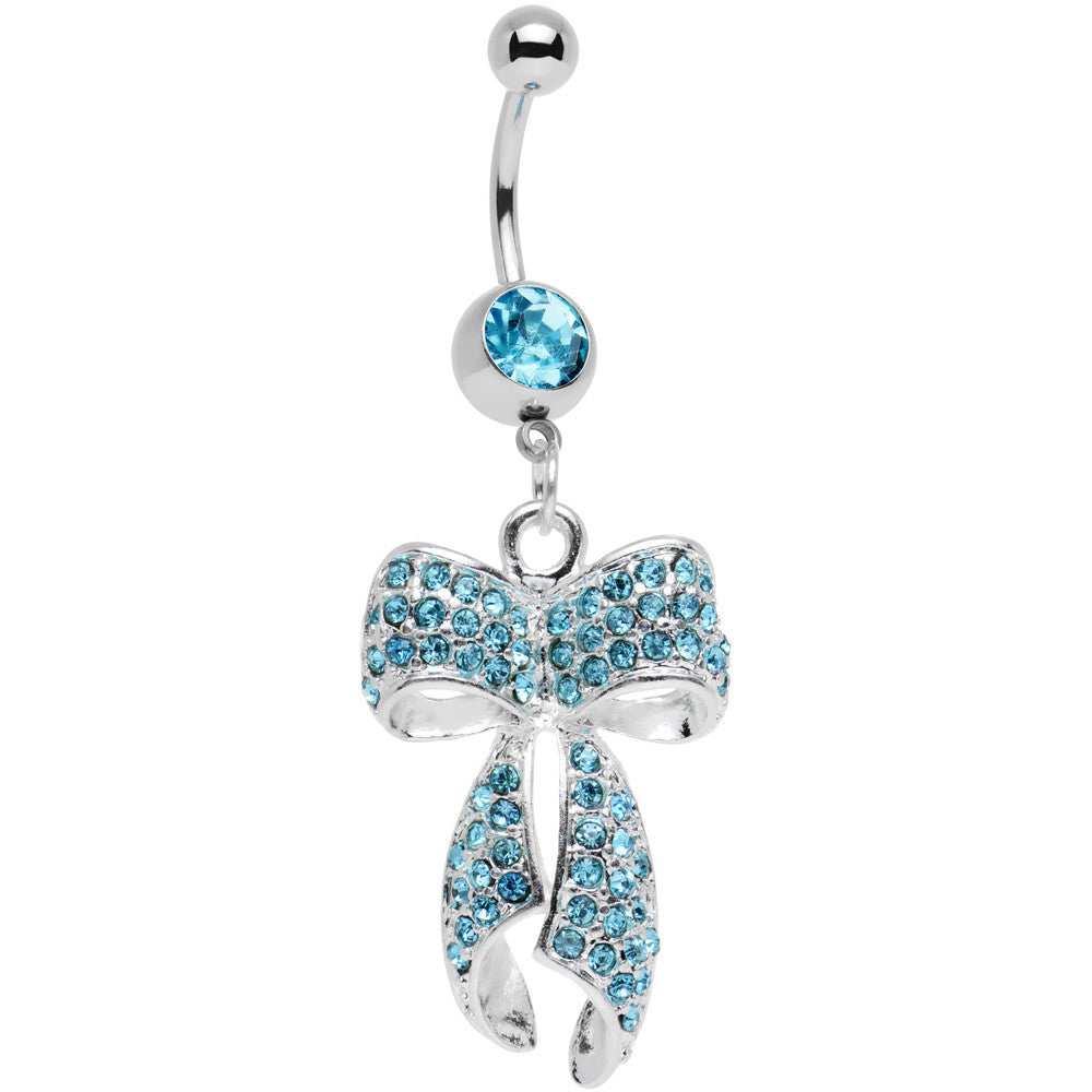 Hypoallergenic jewelry for sensitive skinPut a bow on top (or in this case on the bottom) of your stylish navel piercing with this dangle belly ring featuring an embellished bow charm decorated with aqua gems. The 7/16" long 316L surgical grade stainless steel curved barbell includes a 5mm top ball end and a bottom ball end with a vibrant aqua gem inlay.