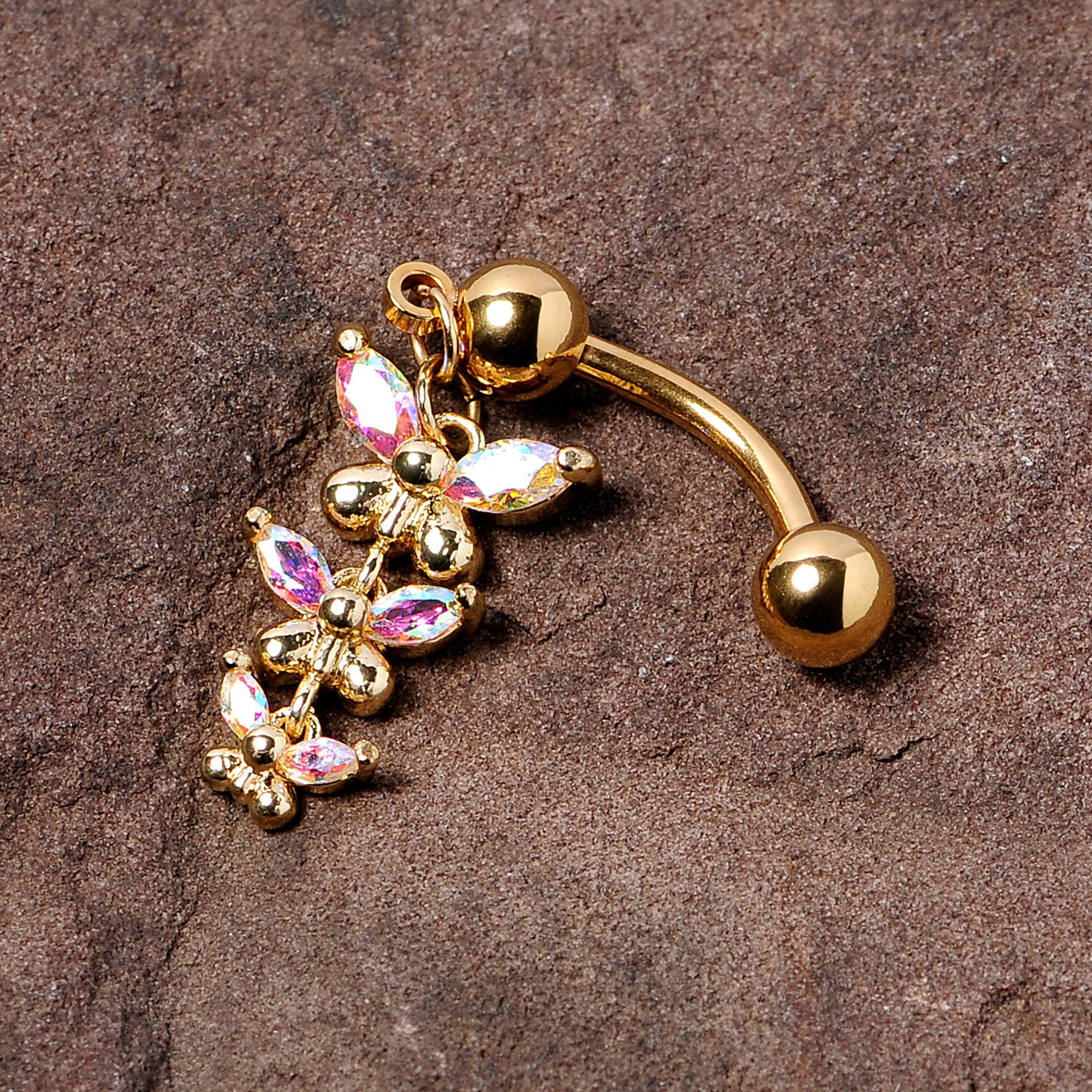 These butterflies all want to hang together...and do so on this gorgeous 14 gauge navel jewelry! It's made with a 3/8" gold tone plated over 316L surgical grade stainless steel curved barbell with 5mm ball ends. It features a butterflies dangle charm that hangs from the top ball end, with wings set with aurora color gems. Combined with the way they sway with the motion of your body, these butterflies are sure to catch the eye! Let these beautiful butterflies beautify your belly button piercing!