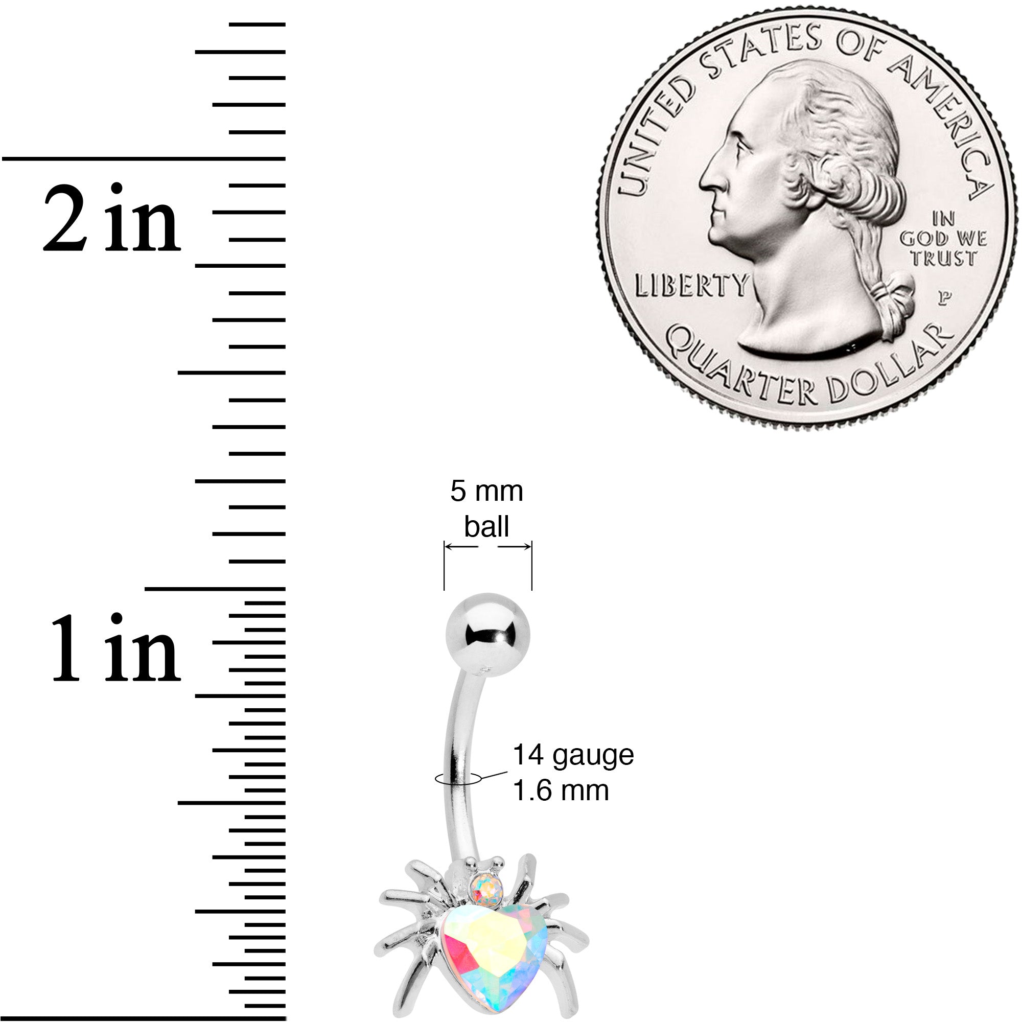 This spider body jewelry will give you the Halloween shivers.....but not shivers of fear! This 14 gauge navel ring is made with a 7/16" durable 316L surgical grade stainless steel curved barbell and has a 5mm top ball end. The bottom end is a spider charm with the body made of a Valentine's Day heart-shaped aurora gem and the head composed of a smaller aurora gem. So whether you cherish creepy crawlies or appreciate arachnids, this belly button ring is sure to snare you in its web!