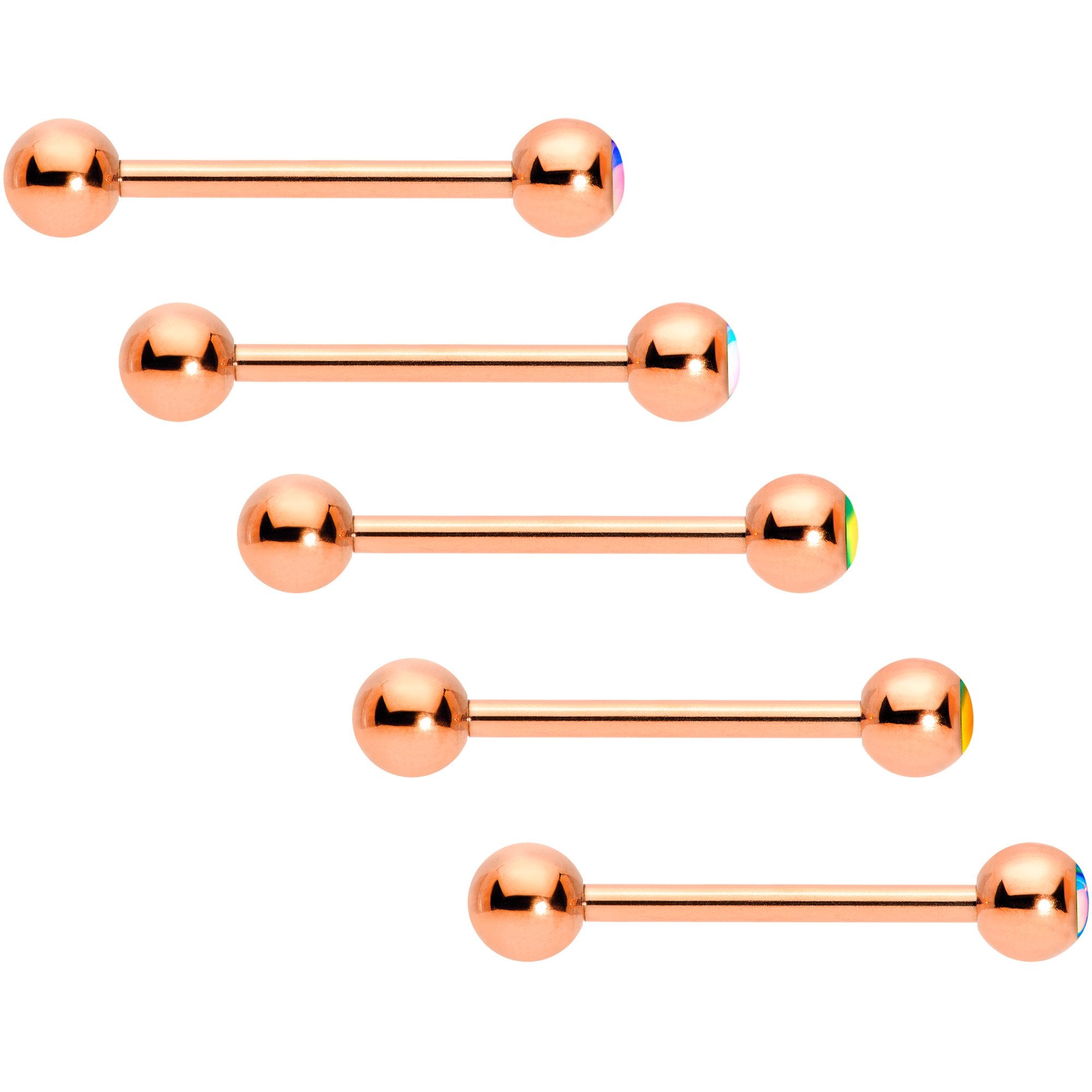 So many pretty colors! This five-pack of 14 gauge tongue rings have a different shade of aurora gem in each piece so you can wear a different color for nearly every day of the week. These tongue barbells are 16mm in length and made of durable rose gold tone PVD over 316L surgical grade stainless steel straight barbells for both style and sturdiness. You'll never get bored or run out of options with so many pretty gems to choose from. Sold as a set of five.