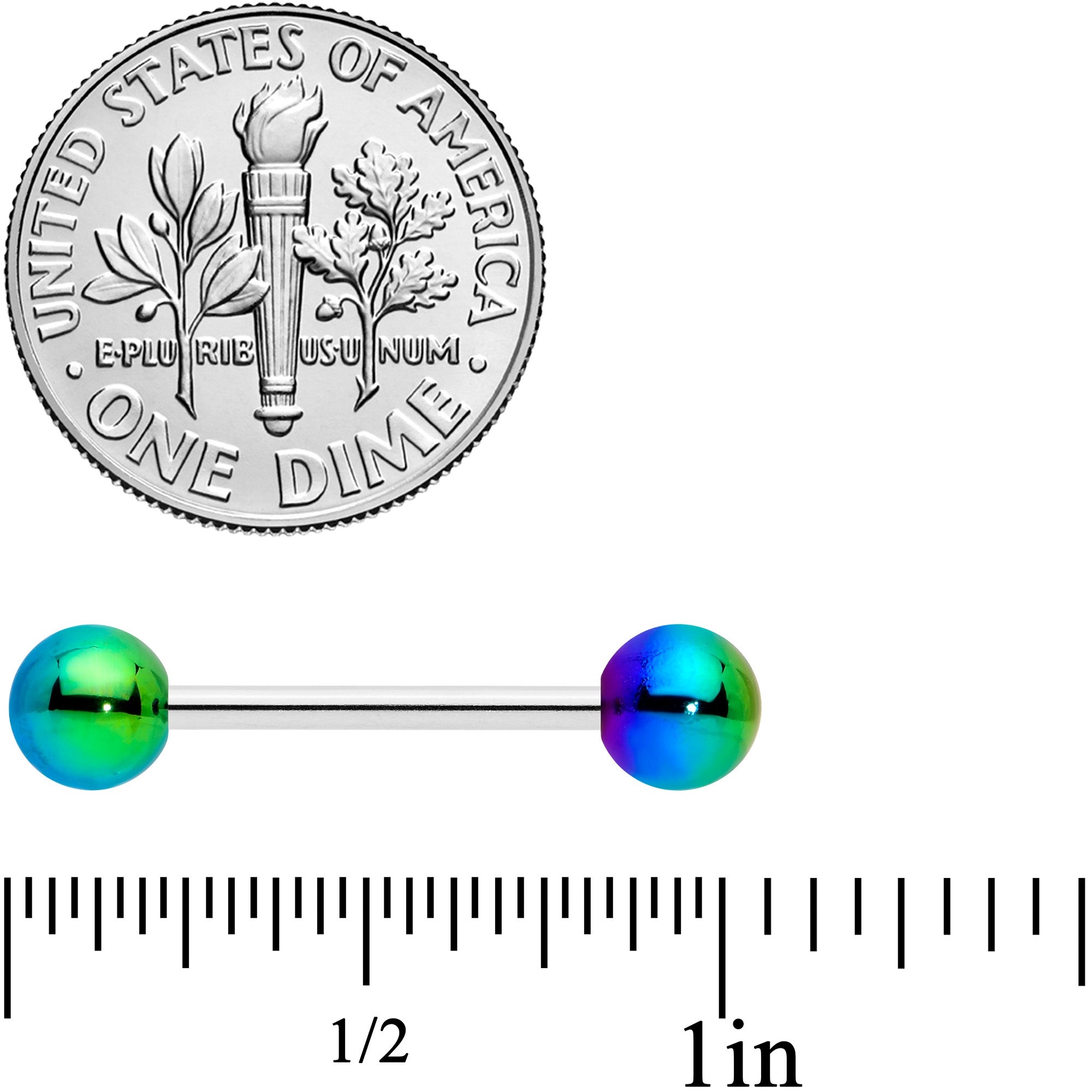 This 14 gauge tongue jewelry is sure to add a splash of color to your style! It's made with a 5/8" durable 316L surgical grade stainless steel straight barbell with 5mm ball ends. The ball ends are aurora color, ranging from blue to green to red, and feature a unique finish that really makes the colors pop! Add a stylish bit of the rainbow to your look with this eye-catching tongue piercing ring!