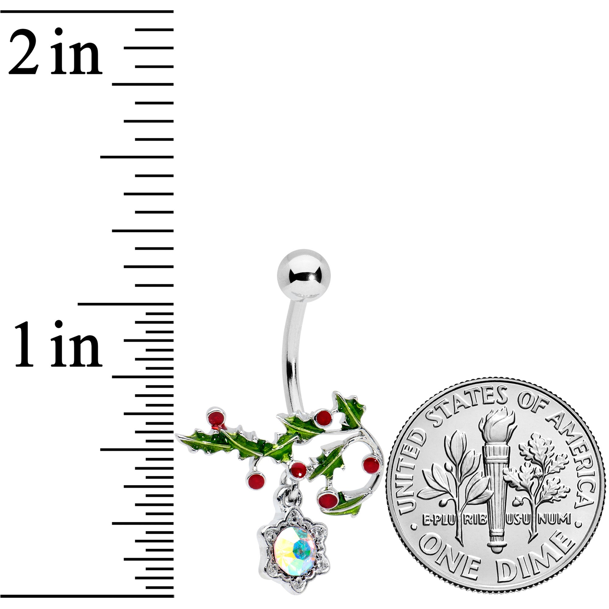 When you're decorating for the holidays, don't forget about this 14 gauge navel ring! It's made with a 3/8" durable 316L surgical grade stainless steel curved barbell with a 5mm top ball end. The bottom end features a holly charm, with green inlaid leaves and red gem berries. Beneath that is stylized ornament charm with an aurora gem at the center for an elegant touch of color. Bedeck your belly for the holidays with this festive belly button piercing jewelry!