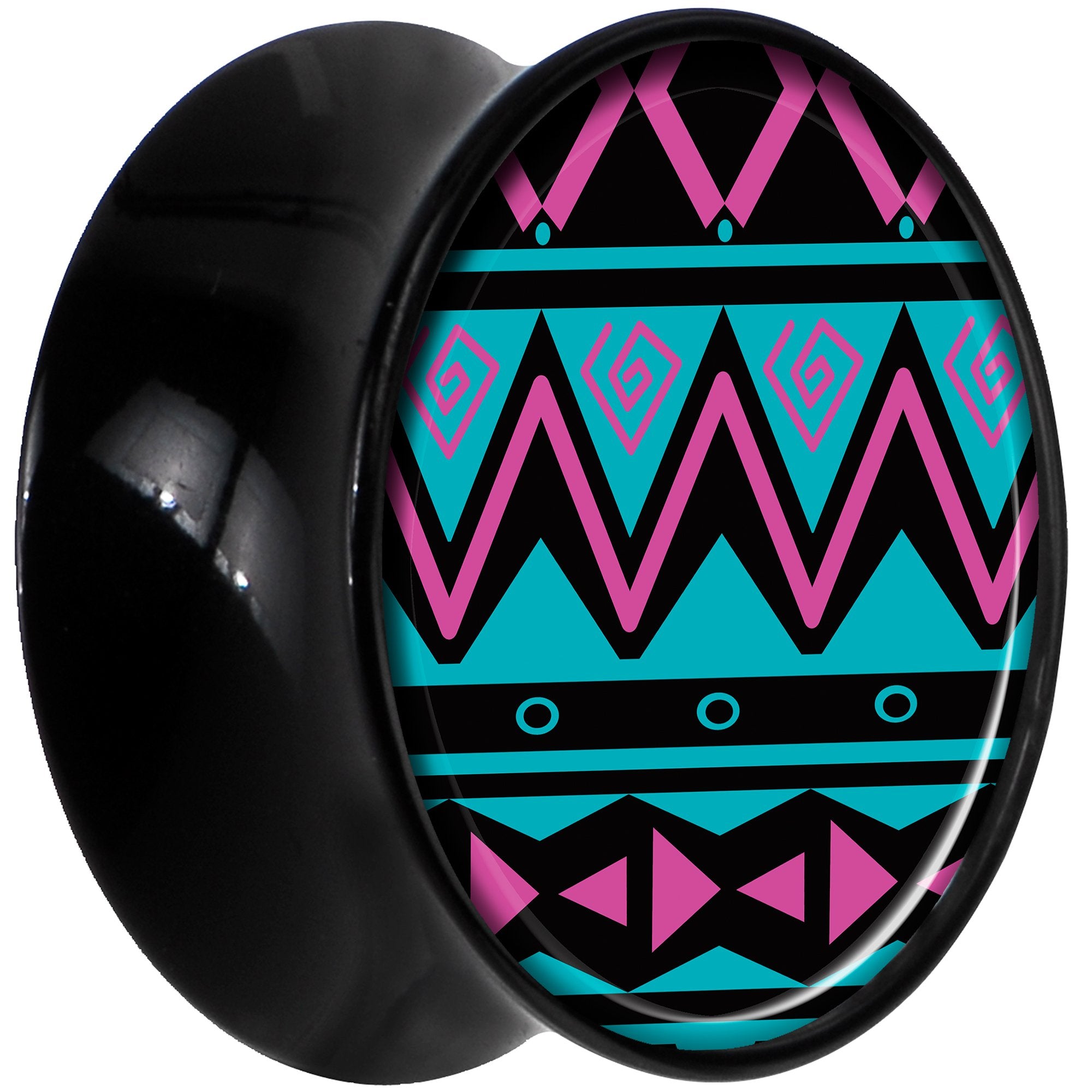 Hypoallergenic jewelry for sensitive skin.Black Acrylic Pink Teal Tribal Print Saddle Plug Set 18mm