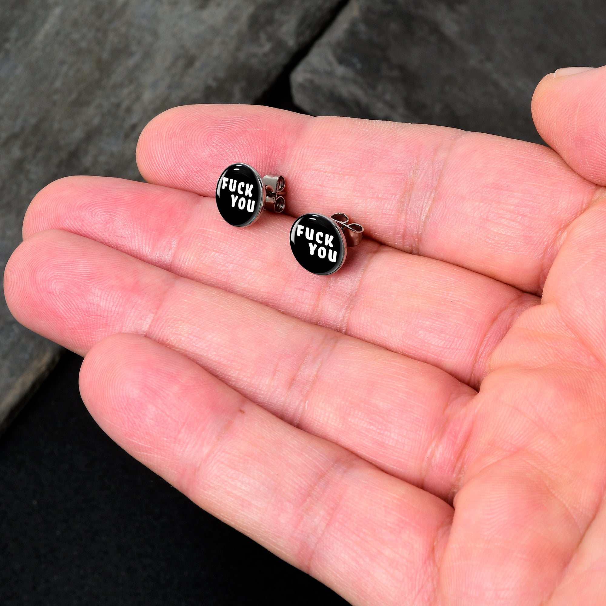 Hypoallergenic jewelry for sensitive skin.Black and White Fuck You Stud Earrings