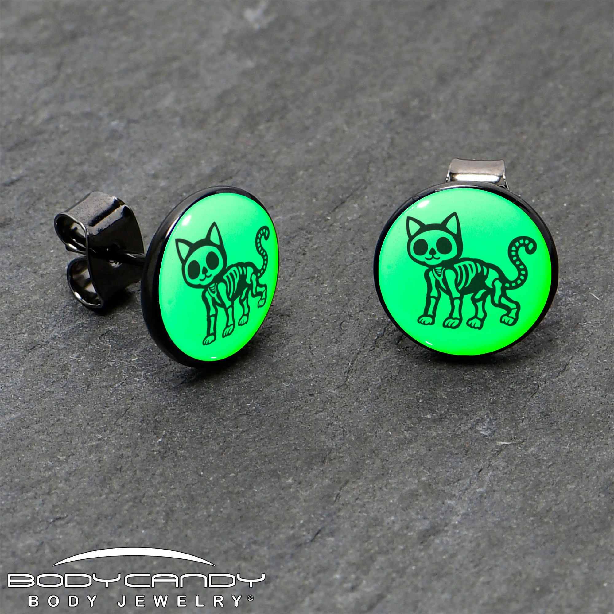 Hypoallergenic jewelry for sensitive skin.Black Anodized Skeleton Kitty Cat Glow in the Dark Stud Earrings