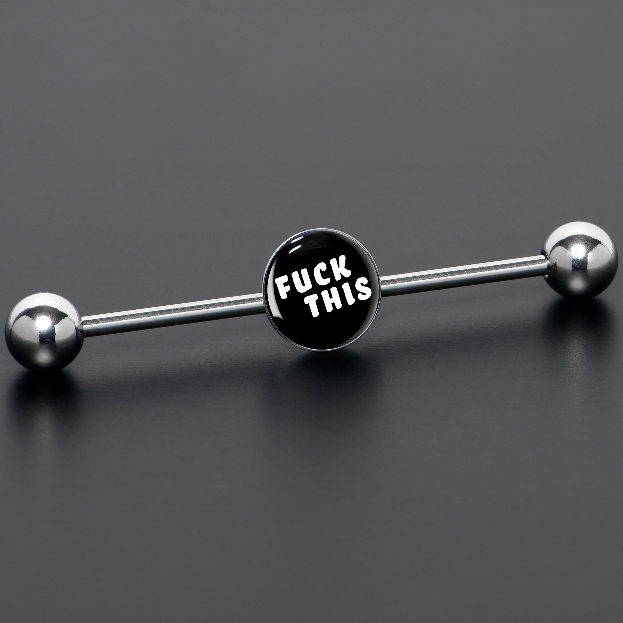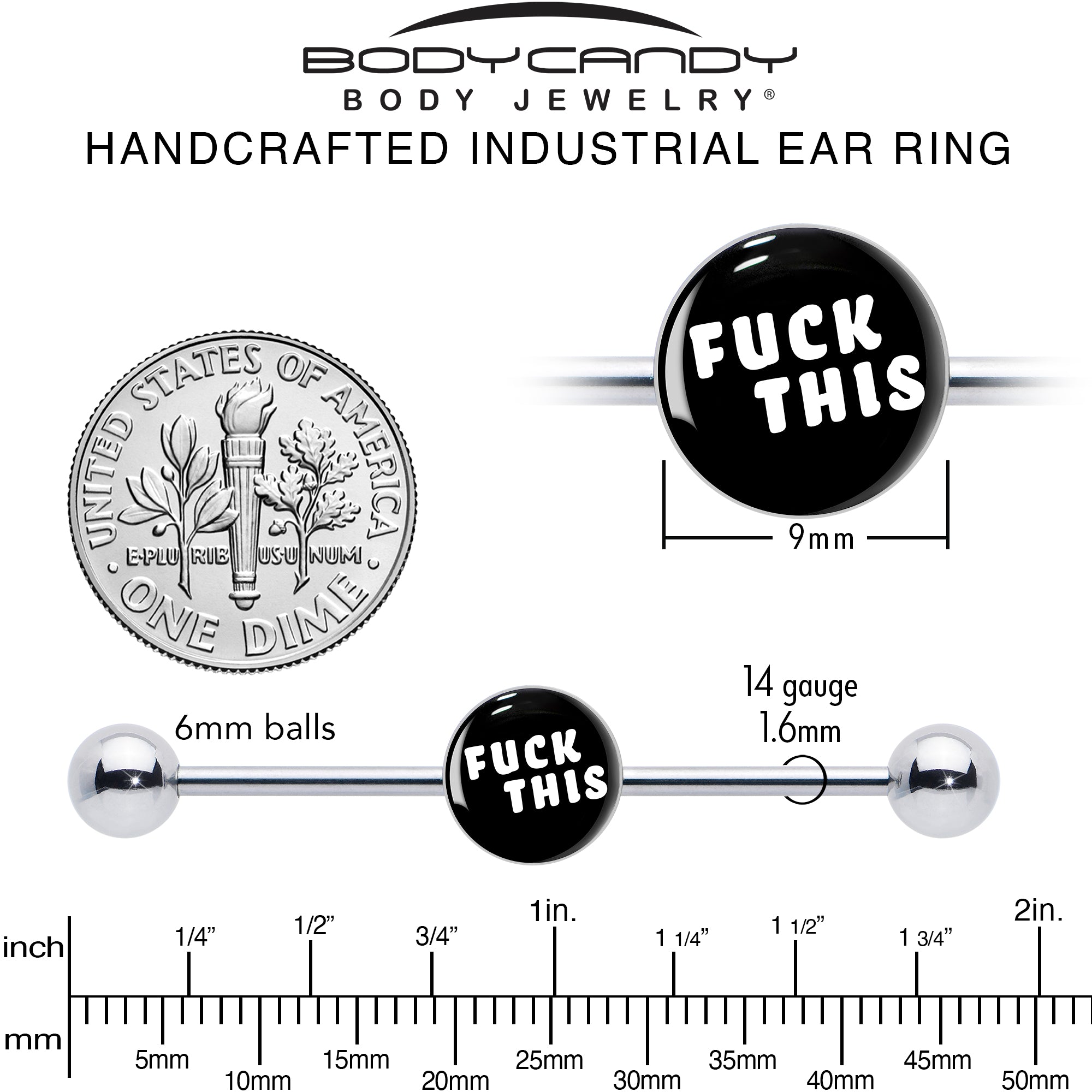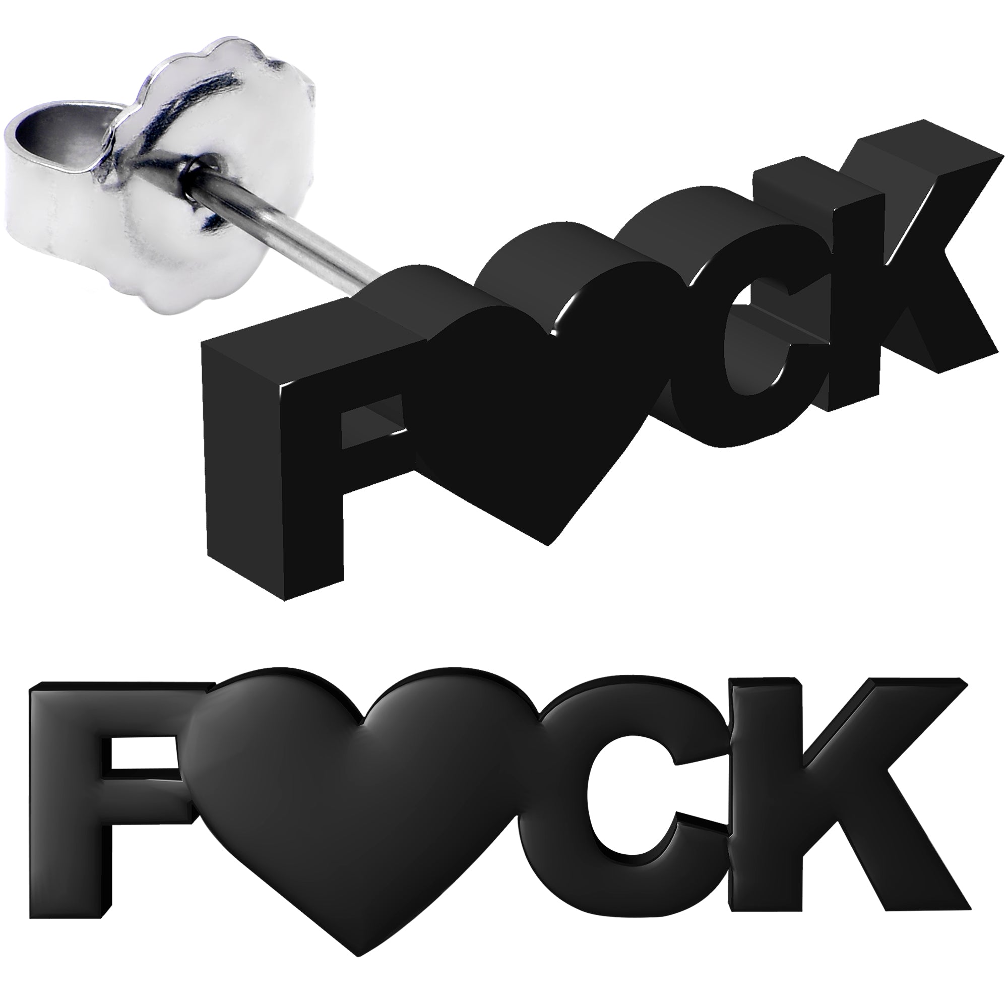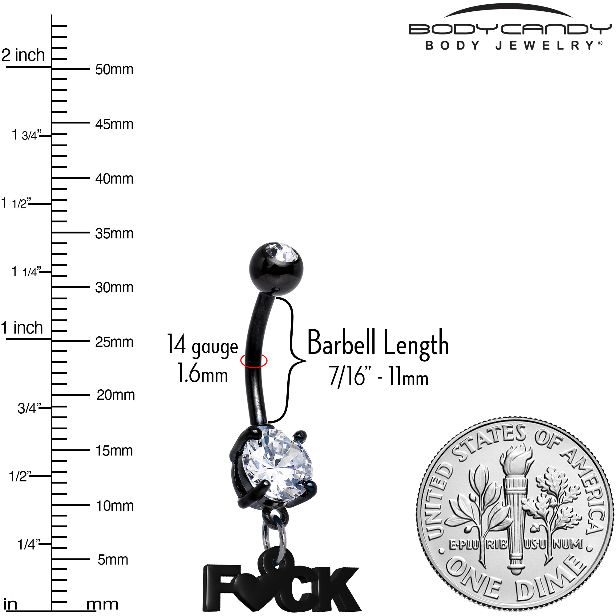 Say what you mean and mean what you say with this 14 gauge navel ring. It's made made with a 7/16 inch black anodized titanium over 316L surgical grade stainless steel with a 5mm top ball end which is set with a clear gem. The bottom features a matching clear gem end. Dangling beneath is a word charm that feature a "F*ck" message with a tiny heart. Let the world know when to stay away with this charmingly blunt belly piercing jewelry. This jewelry item is made to order for you by our staff here in the USA.