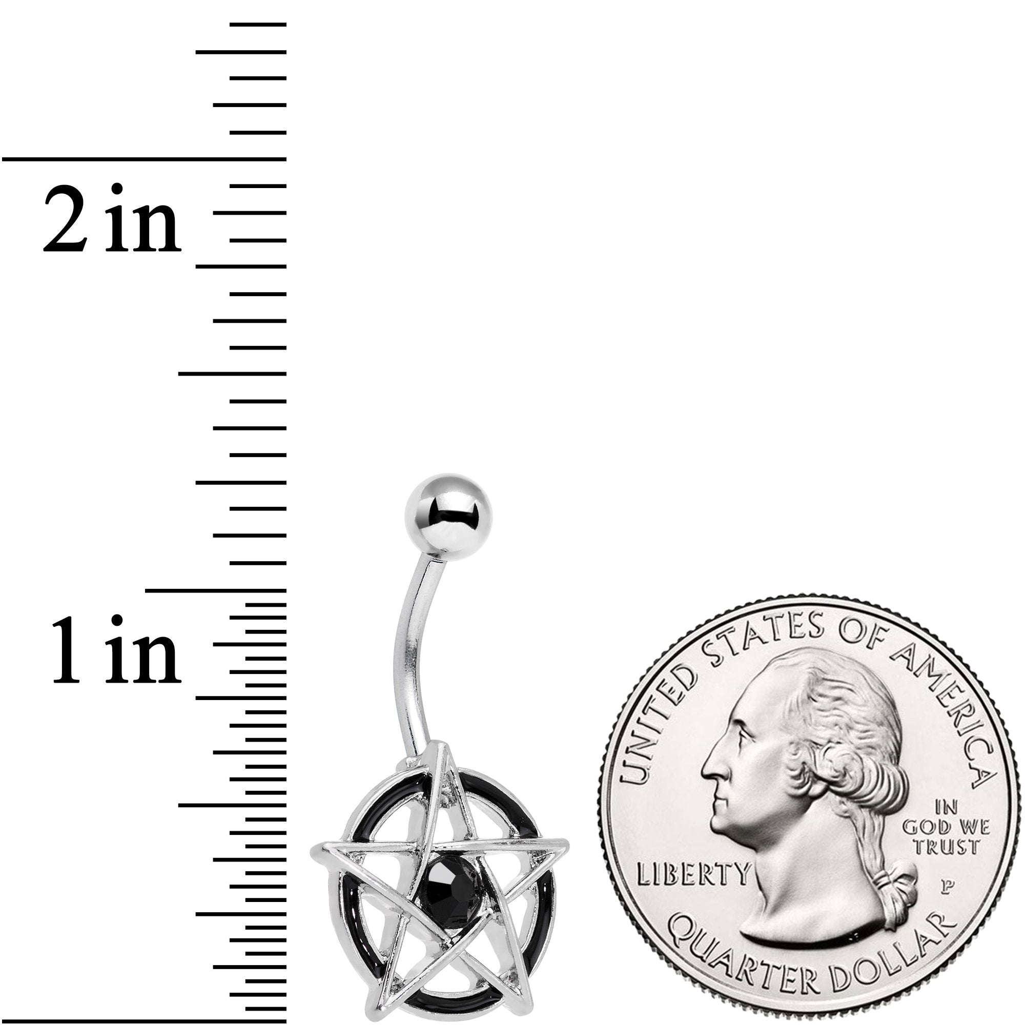 If you love all things dark and black or want to represent your personal beliefs this five pointed star belly button ring is a unique choice. Made with a 7/16" durable 316L surgical grade stainless steel curved barbell, this Halloween inspired navel ring features a pentagram bottom charm with a black frame, set with a single black gem.