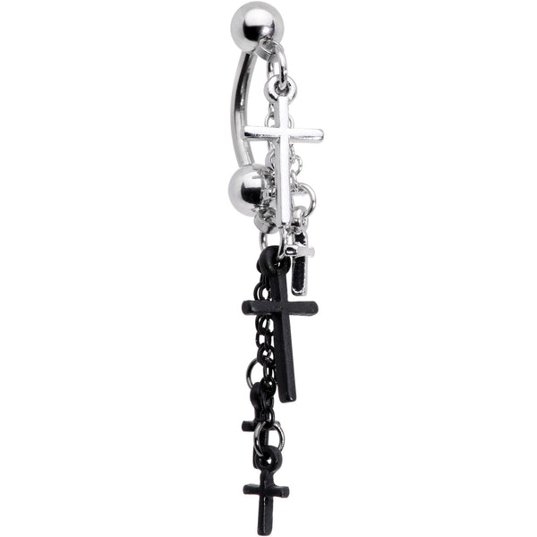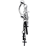 If you love bold beauty and simple style then you will love to wear this pretty 14 gauge top mount belly button ring. Made with a 3/8" durable 316L surgical grade stainless steel curved barbell, this navel piercing has a top mount dangle featuring silver tone and black plated cross charms interconnected by a linked chain.