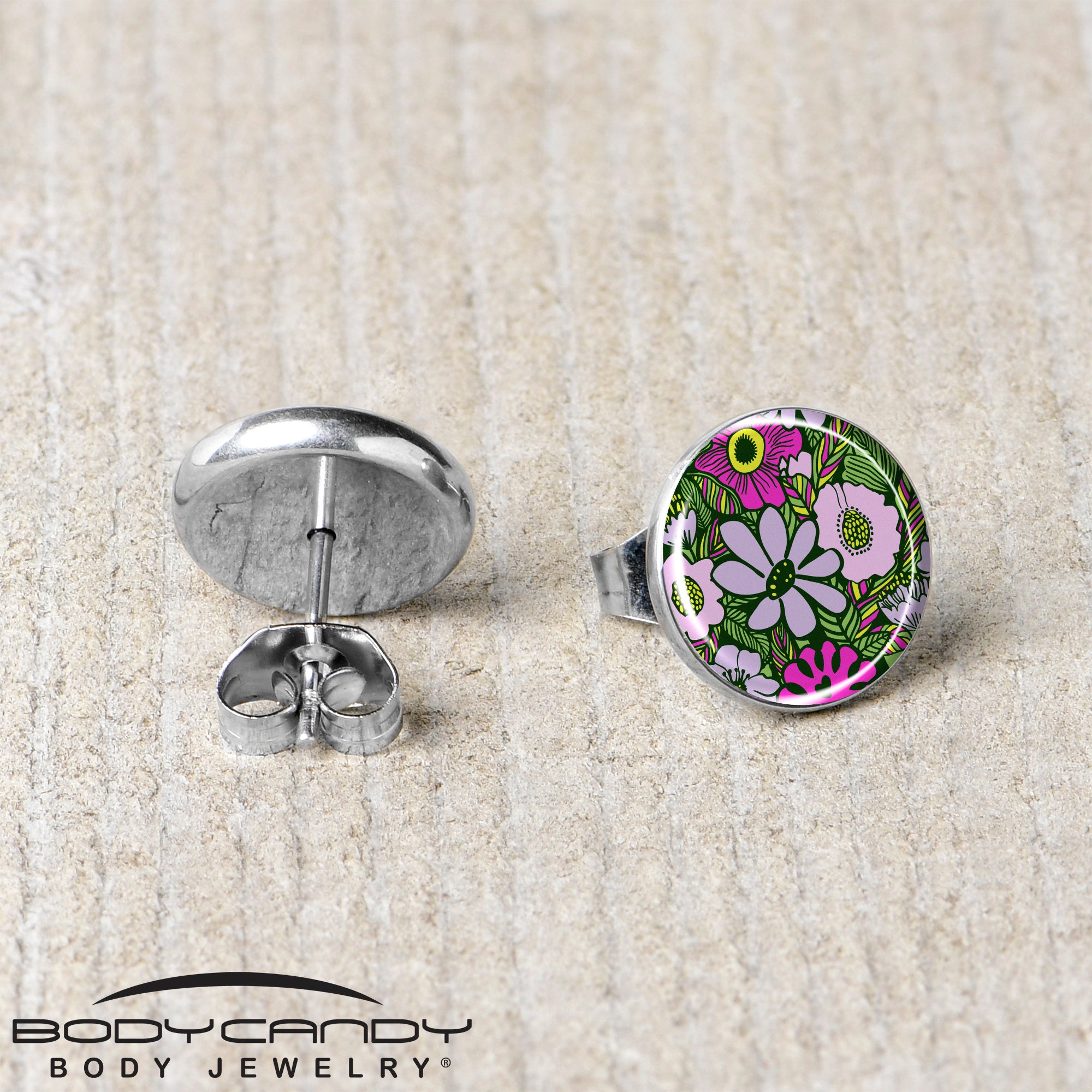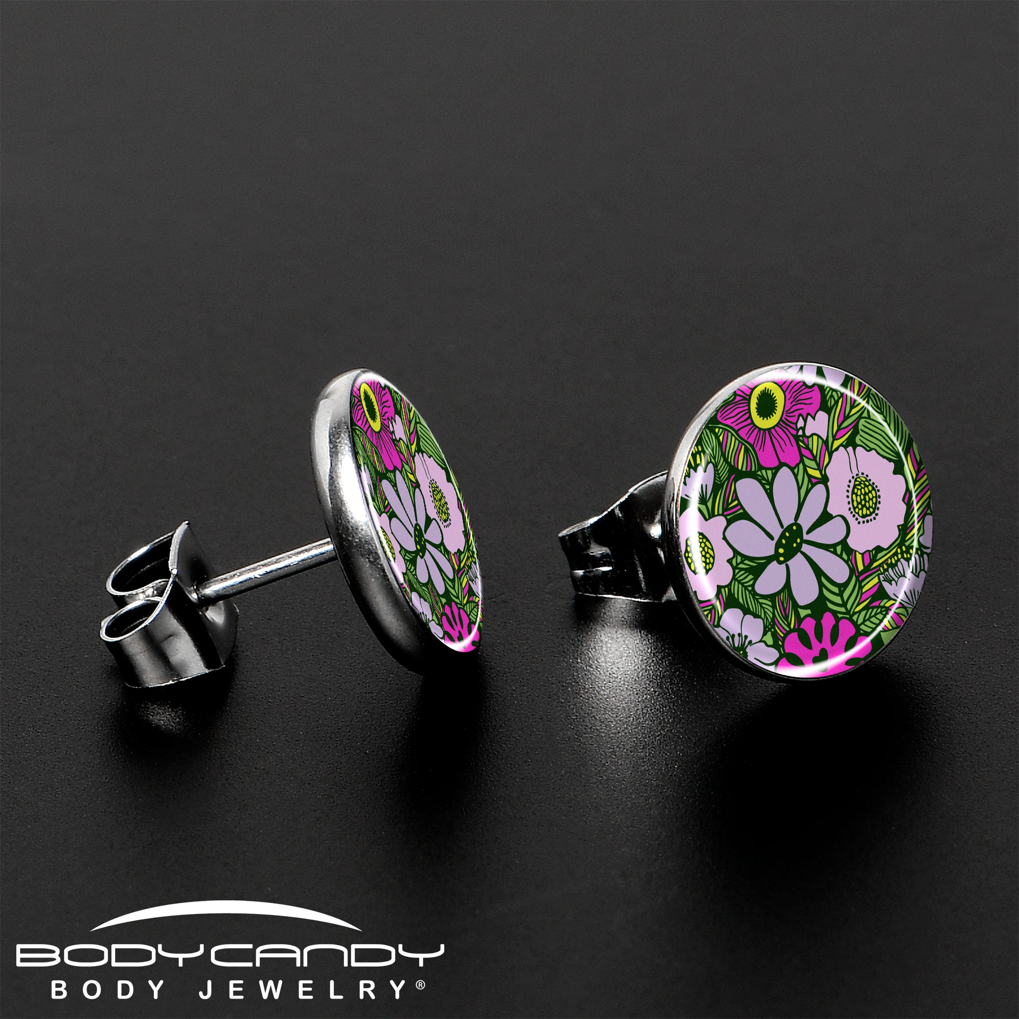 This artist hand drawn flower earrings jewelry is part of our new line of Blossom Creations body piercing jewelry for the season. They're made with stainless steel straight posts with friction backs for a secure fit. These stud earrings for pierced lobes features a logo inlay charm with a whimsical design of pinkish and purplish retro flowers in a field of fun. You'll be in paradise with these delightfully retro floral earrings, Sold as a set of two.
