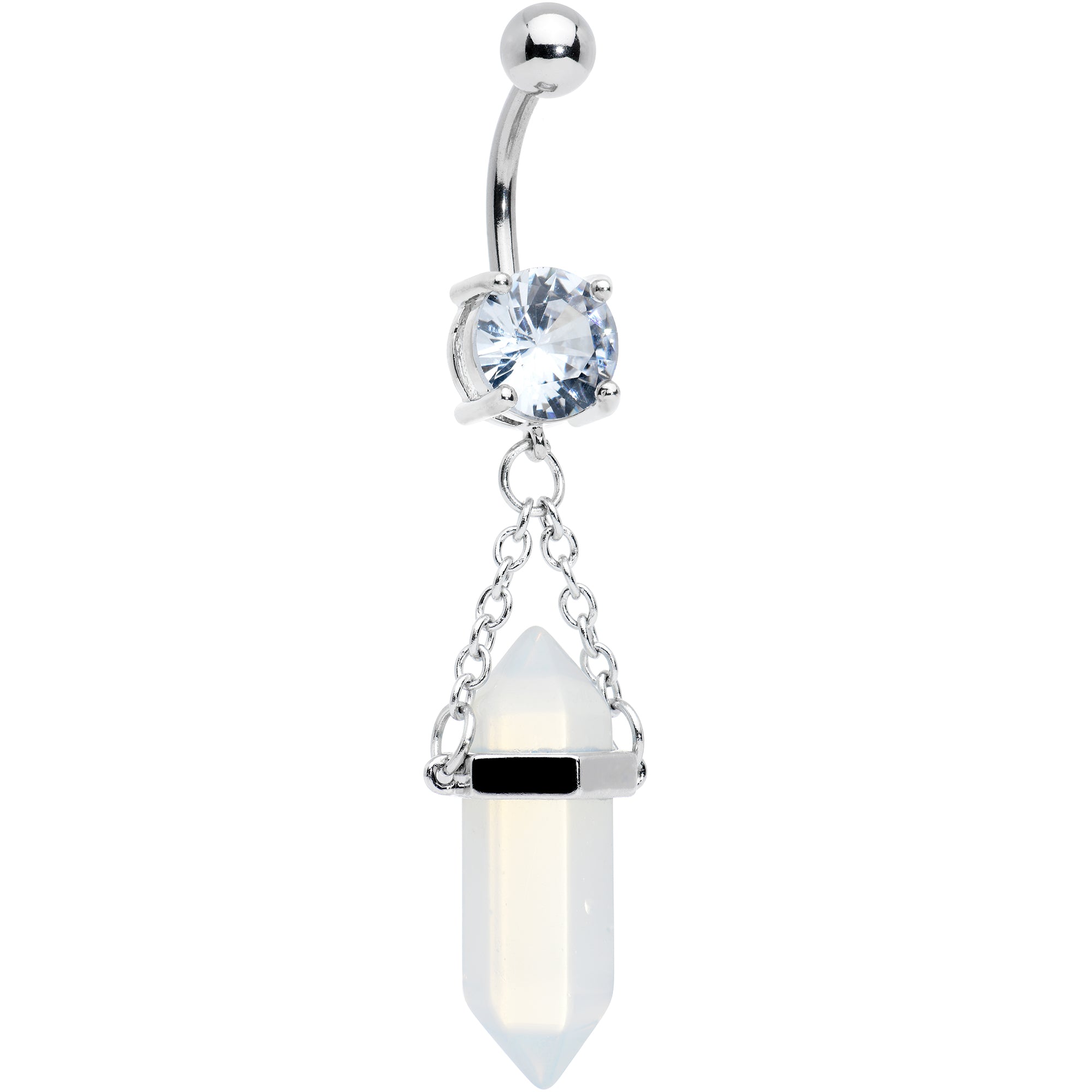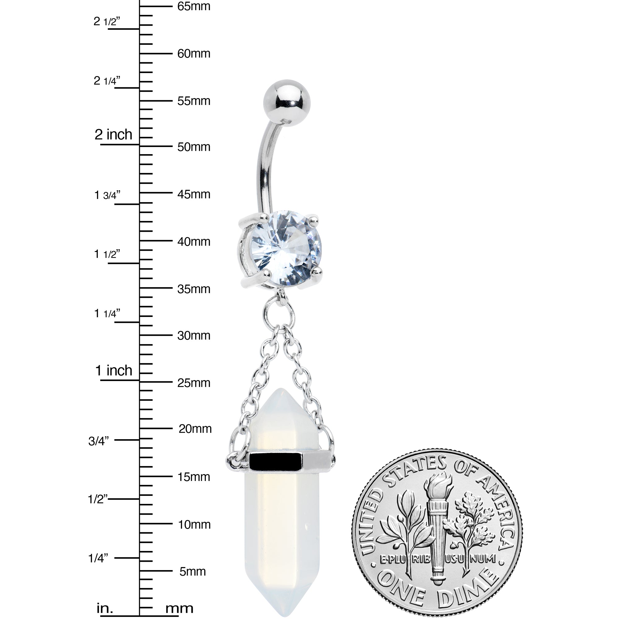 If you're into crystals and incense, this 14 gauge navel ring is sure to give you a happier aura! It's made with a 7/16" durable 316L surgical grade stainless steel curved barbell with a 5mm top ball end. The bottom ball end is a large clear cubic zirconia gem. Dangling beneath that is a pale blue beryl stone that would be so popular among the hippies of the '60s, with its classic obelisk shape. While we can't claim it has any magical powers, it will certainly look magical in your belly button piercing!