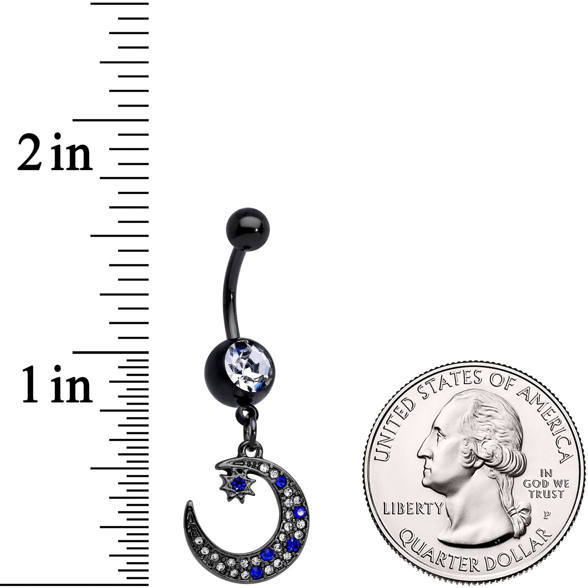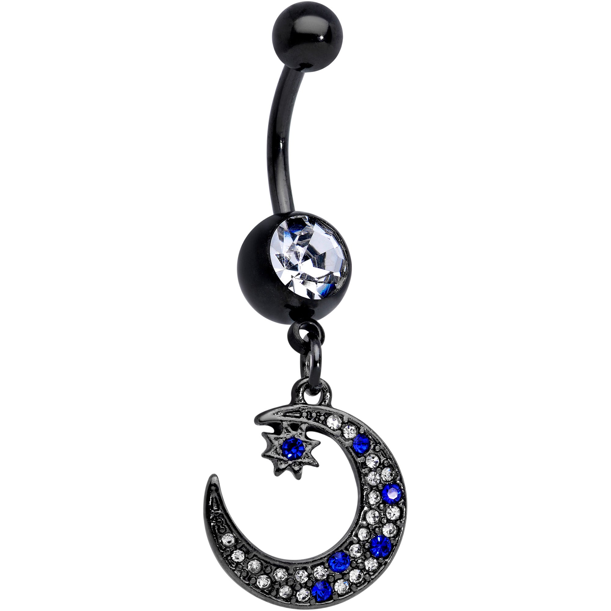 The night sky has come to play on this set of 14 gauge navel jewelry! You get two 3/8" black PVD over 316L surgical grade stainless steel curved barbells. Each one features a plain black 5mm top ball end and 8mm black bottom ball ends, which are each set with a large clear gem. Dangling beneath one bottom ball end is a crescent moon charm, set with blue and clear gems. At the top point of the crescent moon is a star, set at the center with a blue gem. The other navel ring features a large dangling star charm, set with matching clear gems and a blue gem center. Celebrate the skies with this celestial set of belly jewelry! Sold as a set of two.