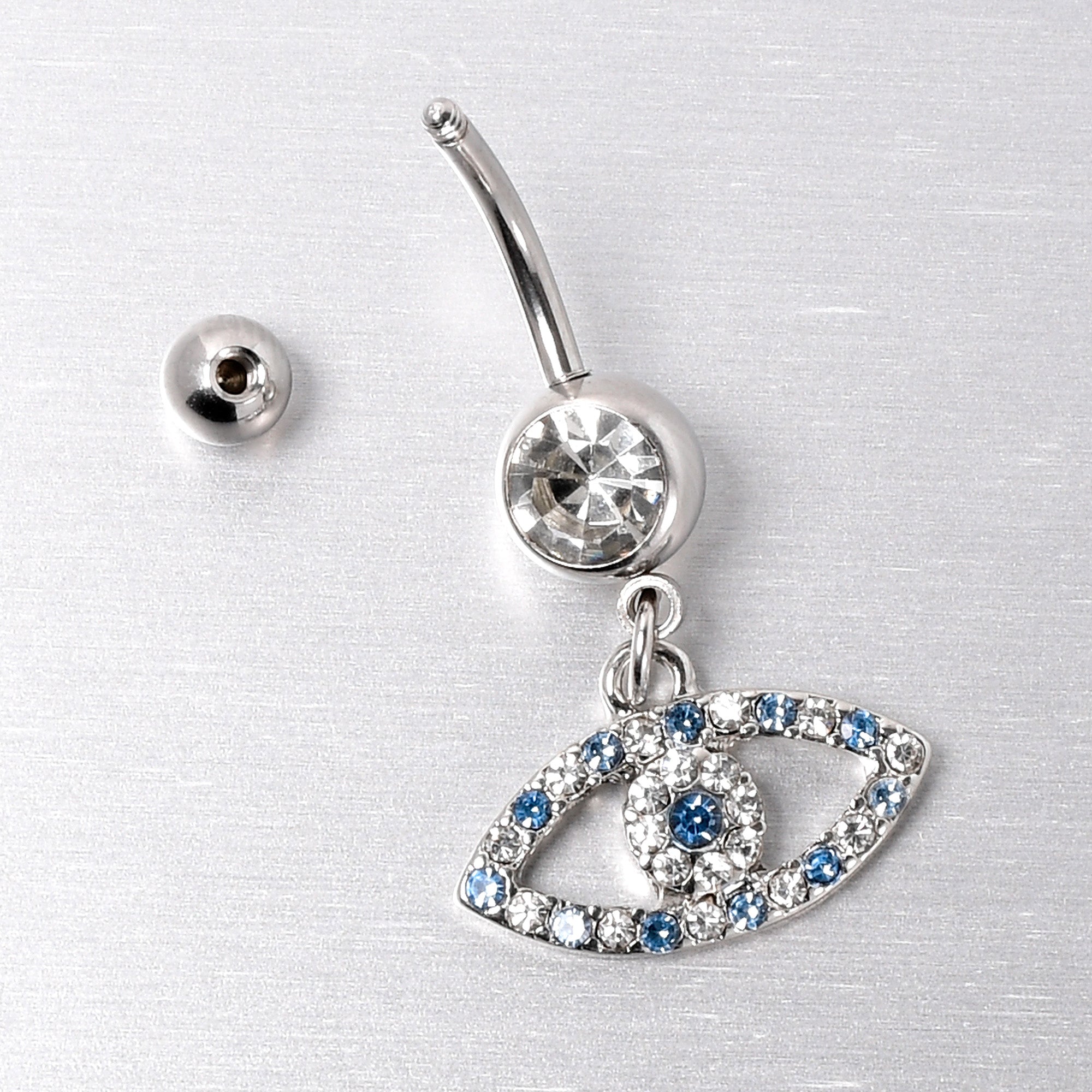 Keep your eyes open and you will spot amazing things - like this 14 gauge navel ring. It is made with a 3/8 inch durable 316L surgical grade stainless steel curved barbell with a 5mm top ball end. The bottom ball end is 8mm and set with a clear gem.Dangling beneath is an eye charm, with the rim paved in blue and clear gems. The center of the eye features more clear and blue gems for a cohesive look. You will have all eyes on you with this eye-opening belly piercing ring.