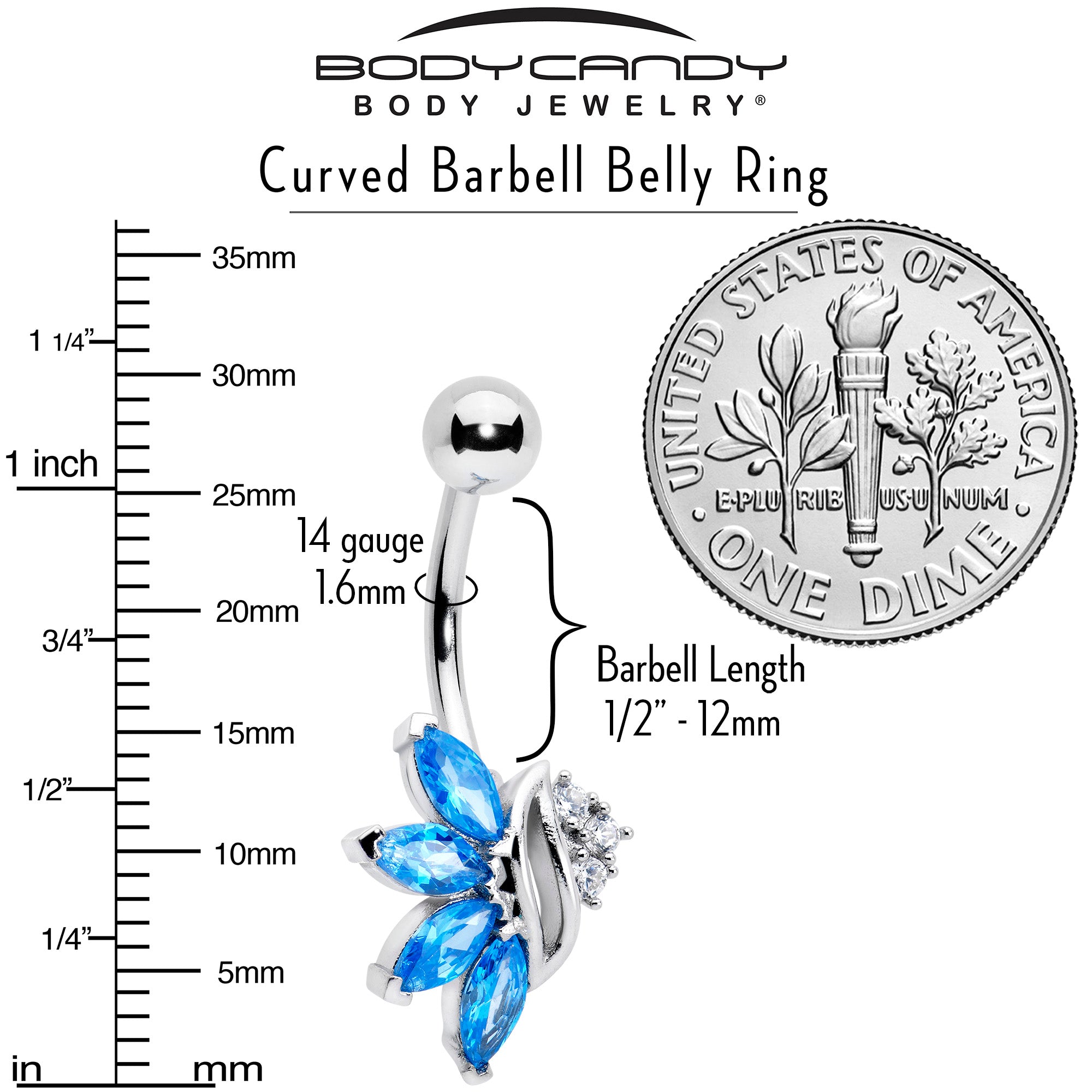 You're sure to be a fan of this 14 gauge navel ring. It's made with a 3/8 inch 316L surgical grade stainless steel curved barbell with a 5mm top ball end. The bottom end features a blue cubic zirconia gem fan charm, set above a swirl embellishment. At the base are clear cubic zirconia gems for an added touch of style. This belly piercing jewelry has so much glamour it'll make your head swirl.
